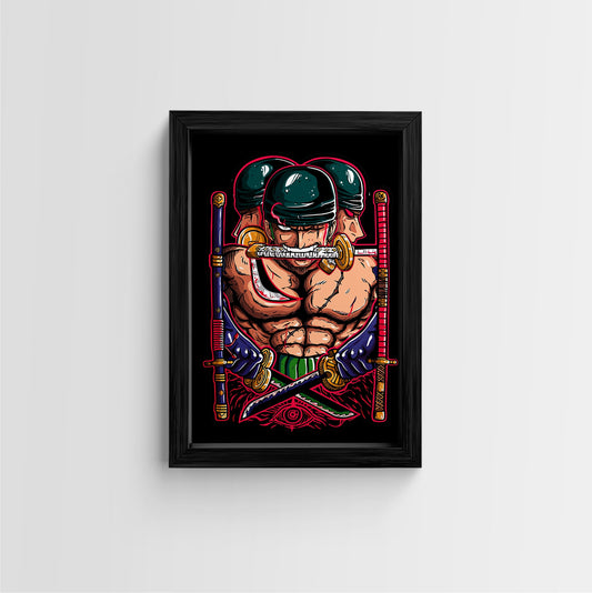 This vibrant framed art print showcases Roronoa Zoro, the swordsman of the Straw Hat Pirates,...