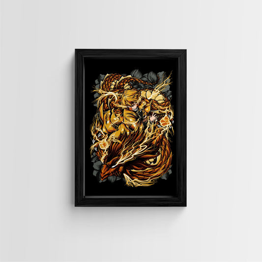 This captivating framed art print showcases a powerful warrior surrounded by two majestic golden dragons,...