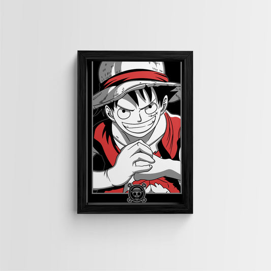 This stylish black and white framed art print features Monkey D. Luffy, the iconic protagonist...