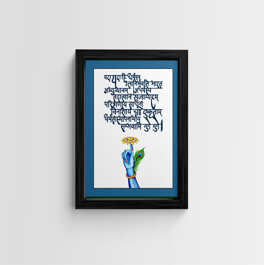 This exquisite framed art print showcases a beautiful calligraphy of the Bhagavad Gita's iconic verse,...