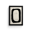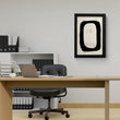 This abstract black and white framed art print invites contemplation. A bold black shape, resembling the letter ‘O’ or zero, takes center stage. The artwork exudes an aged texture, evoking an antique allure. The dark frame accentuates the contrast between light and shadow. Versatile for various room settings, from living rooms to offices, it adds an enigmatic touch to your space.