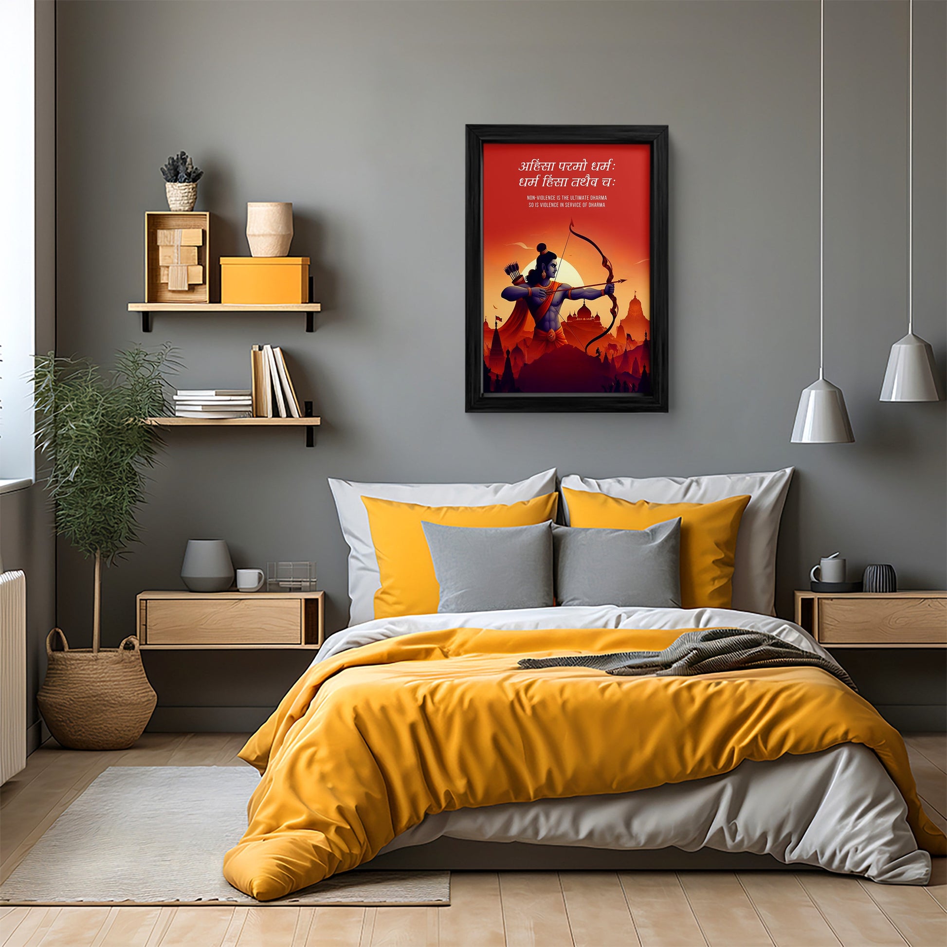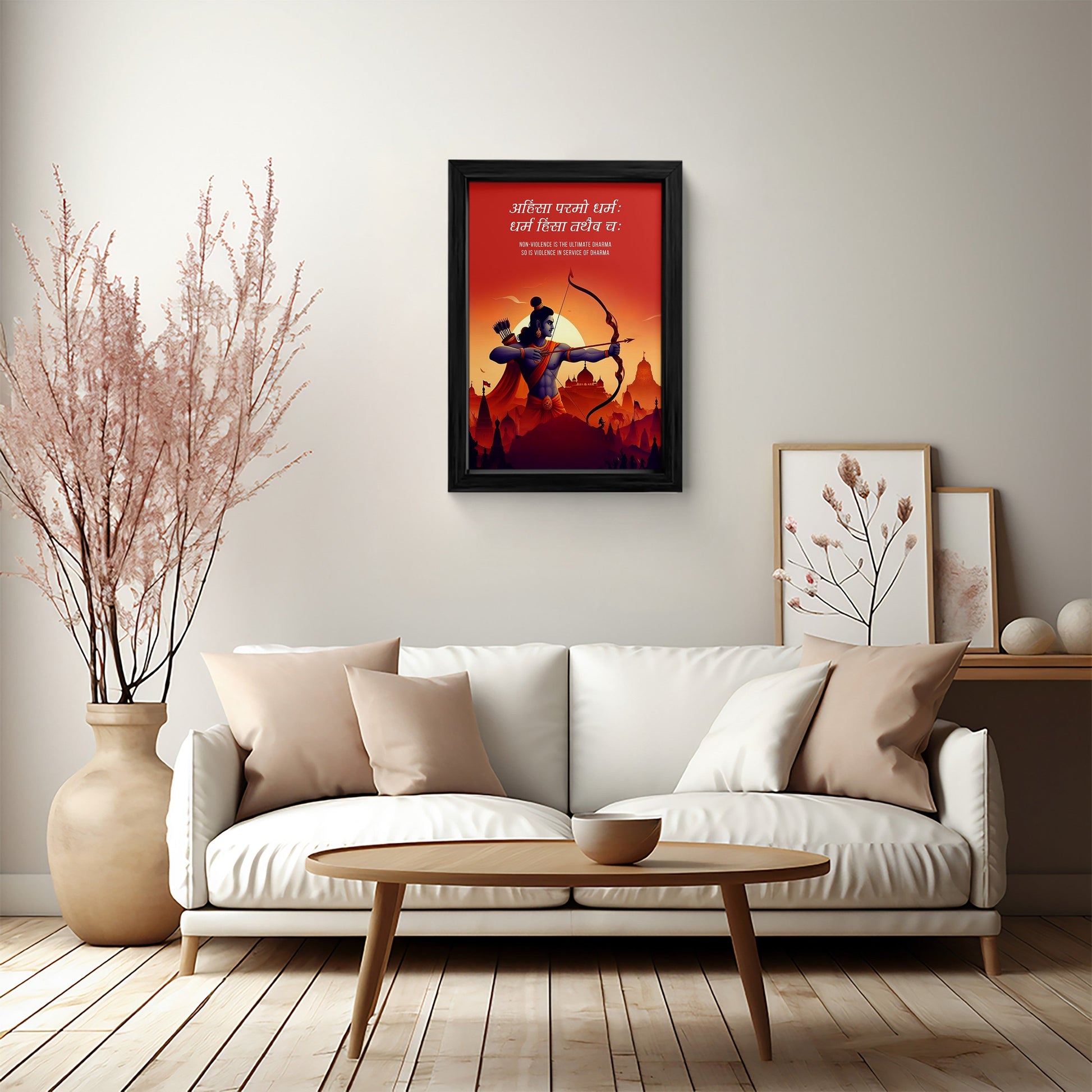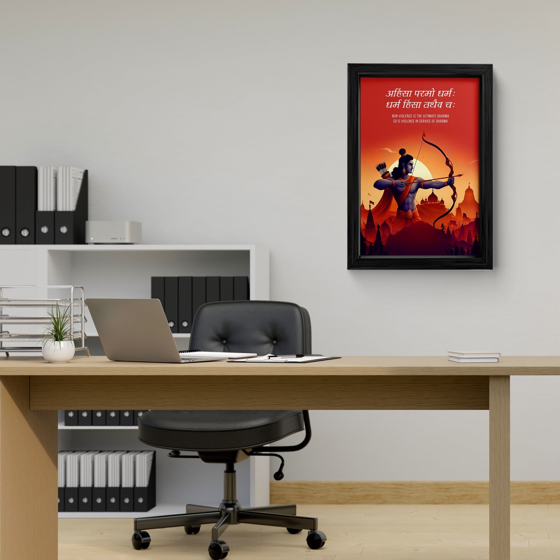 This beautifully framed art print showcases Lord Rama, a symbol of righteousness and non-violence, with the powerful message "Ahinsa Parmo Dharma" (Non-violence is the ultimate dharma). This piece is perfect for home decor or office spaces, adding a touch of spirituality and inspiration. It's a must-have for those seeking wall art that combines art and philosophy.