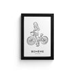 Step into a world where art meets style with Boheme Elegance- This exquisite framed art print features a contemporary line drawing of a figure alongside a classic bicycle, embodying the essence of modern elegance- Crafted with precision and care, this piece is a perfect blend of minimalist design and intricate detailing- The monochromatic scheme enhances the artworks sophistication, making it a versatile addition to any space- Elevate your home or office décor with this captivating canvas painting, where modern design meets timeless beauty-