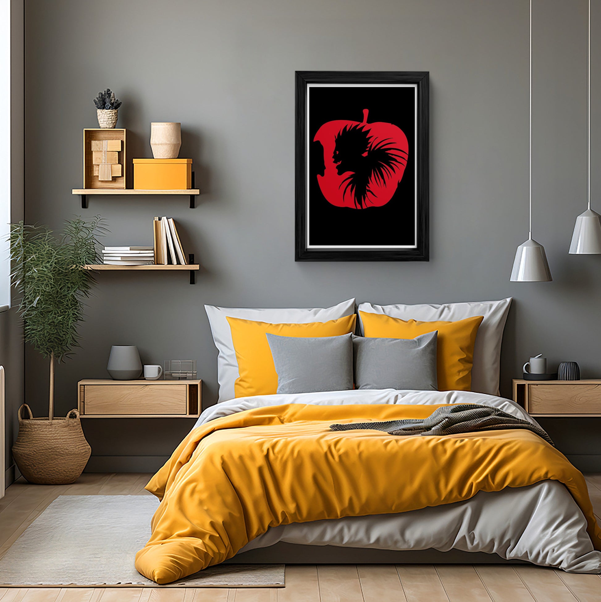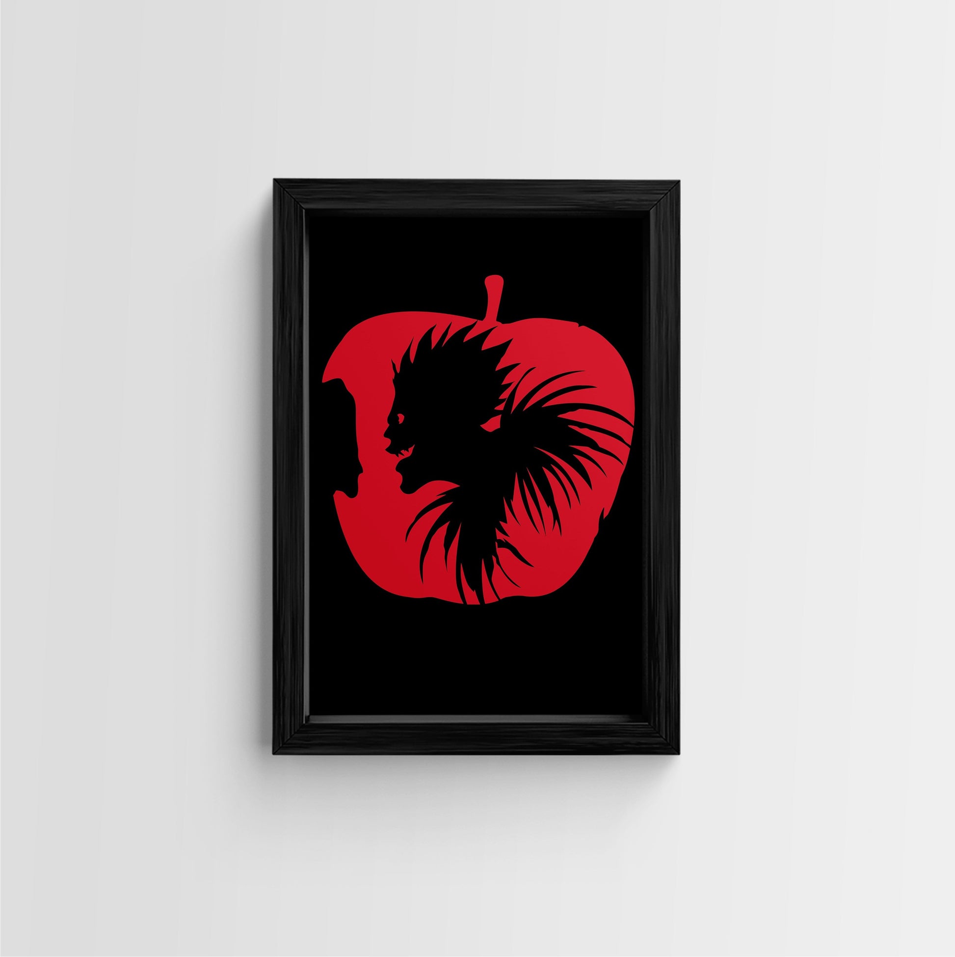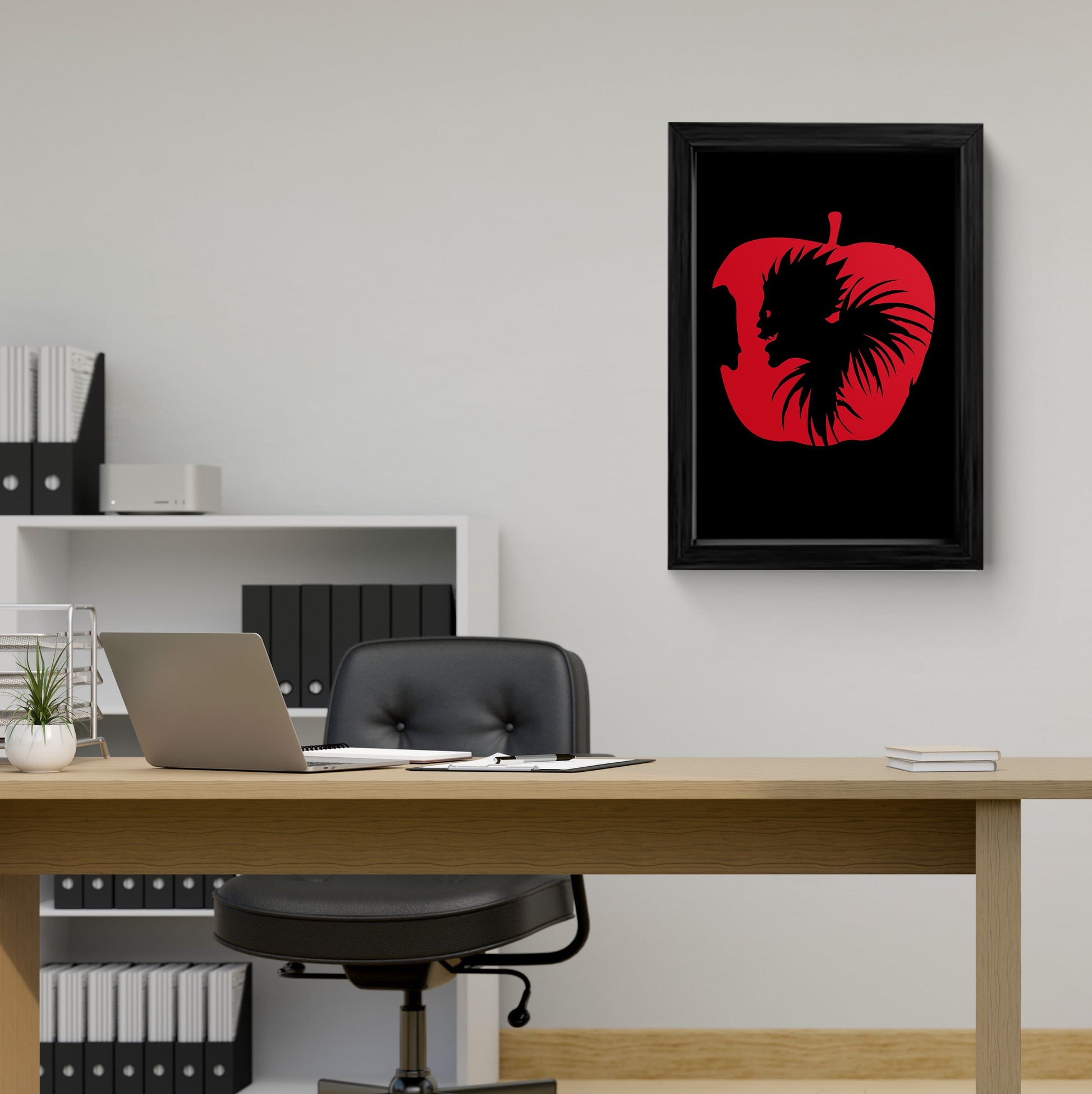This captivating framed wall art features a striking silhouette of Ryuk, the Shinigami from Death Note, emerging from a red apple. This minimalist design is perfect for adding a touch of anime-inspired style to your home or office. The high-quality canvas print is framed in a sleek black frame, making it ready to hang on your wall.