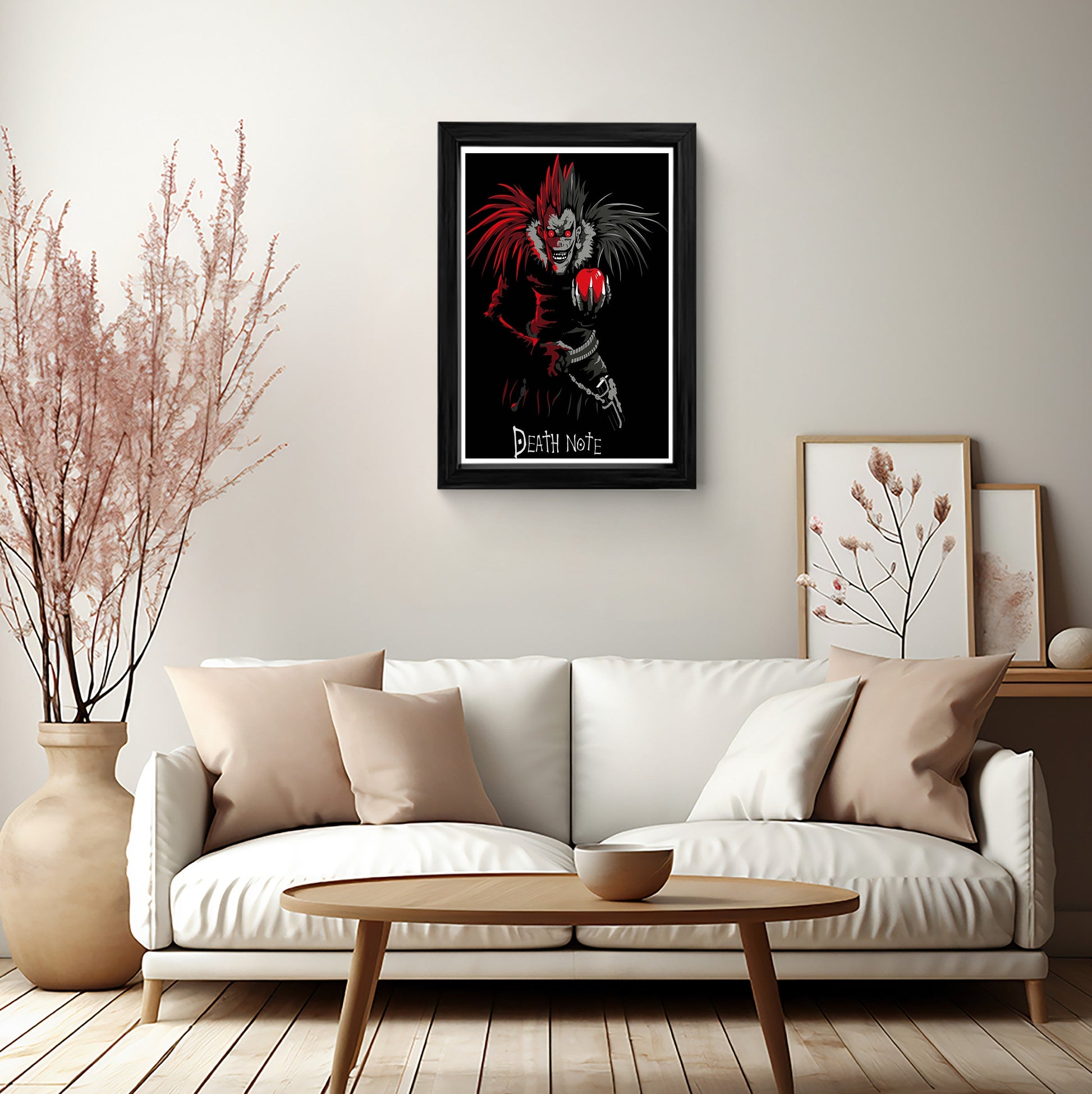 Elevate your space with this captivating Death Note Ryuk wall art. The framed print showcases the iconic shinigami in a striking red and black color scheme. Perfect for anime fans and those seeking unique home decor. This high-quality canvas wall art adds a touch of mystery and intrigue to any room.