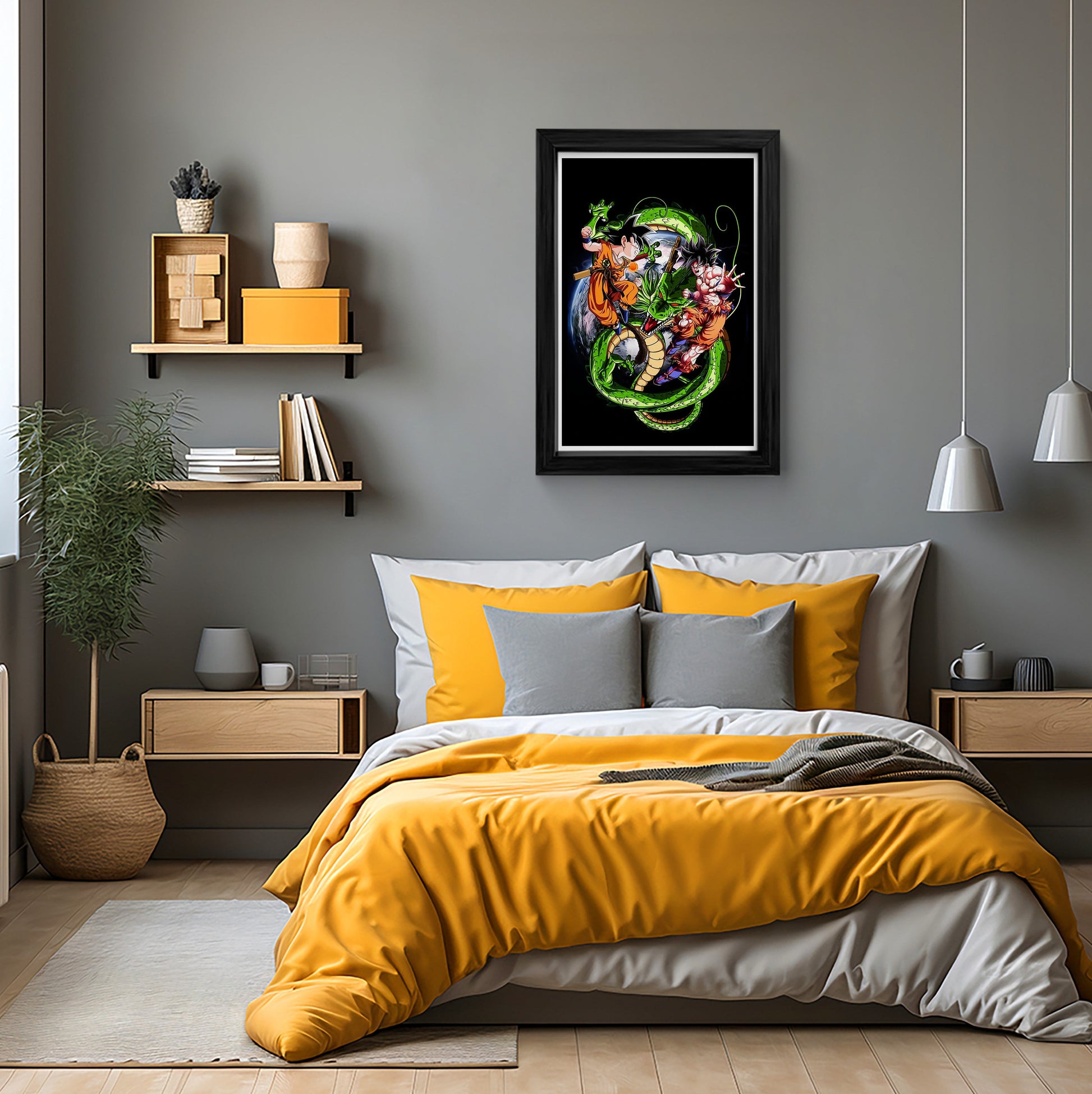 Capture the intense energy and iconic characters of Dragon Ball Z with this stunning framed art print. Featuring Goku, Gohan, and Piccolo battling against the mighty Shenron, this piece is a must-have for any anime fan. The vibrant colors and dynamic action make it a captivating addition to any wall. Display it in your living room, bedroom, or home office to showcase your love for this beloved series.