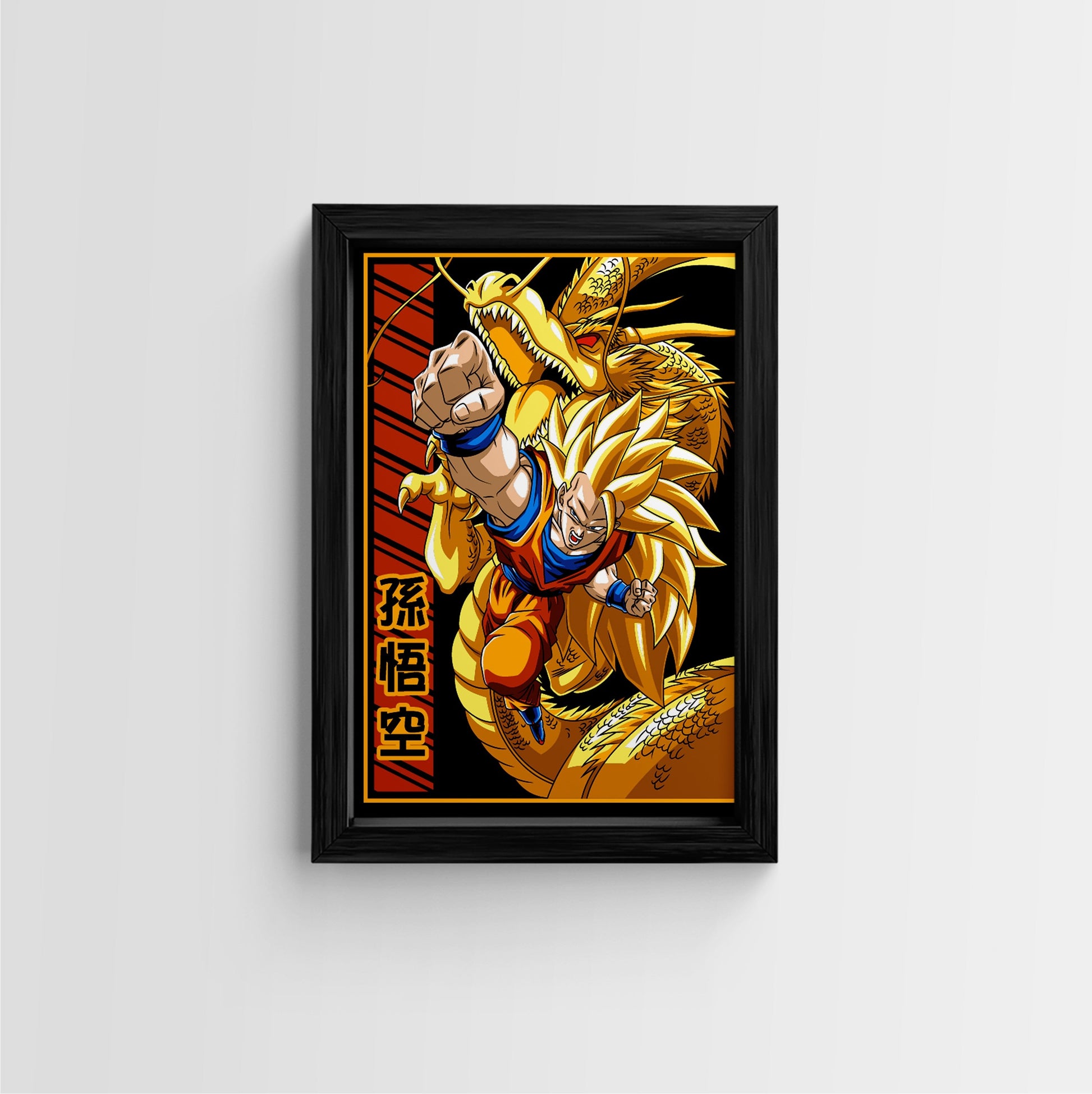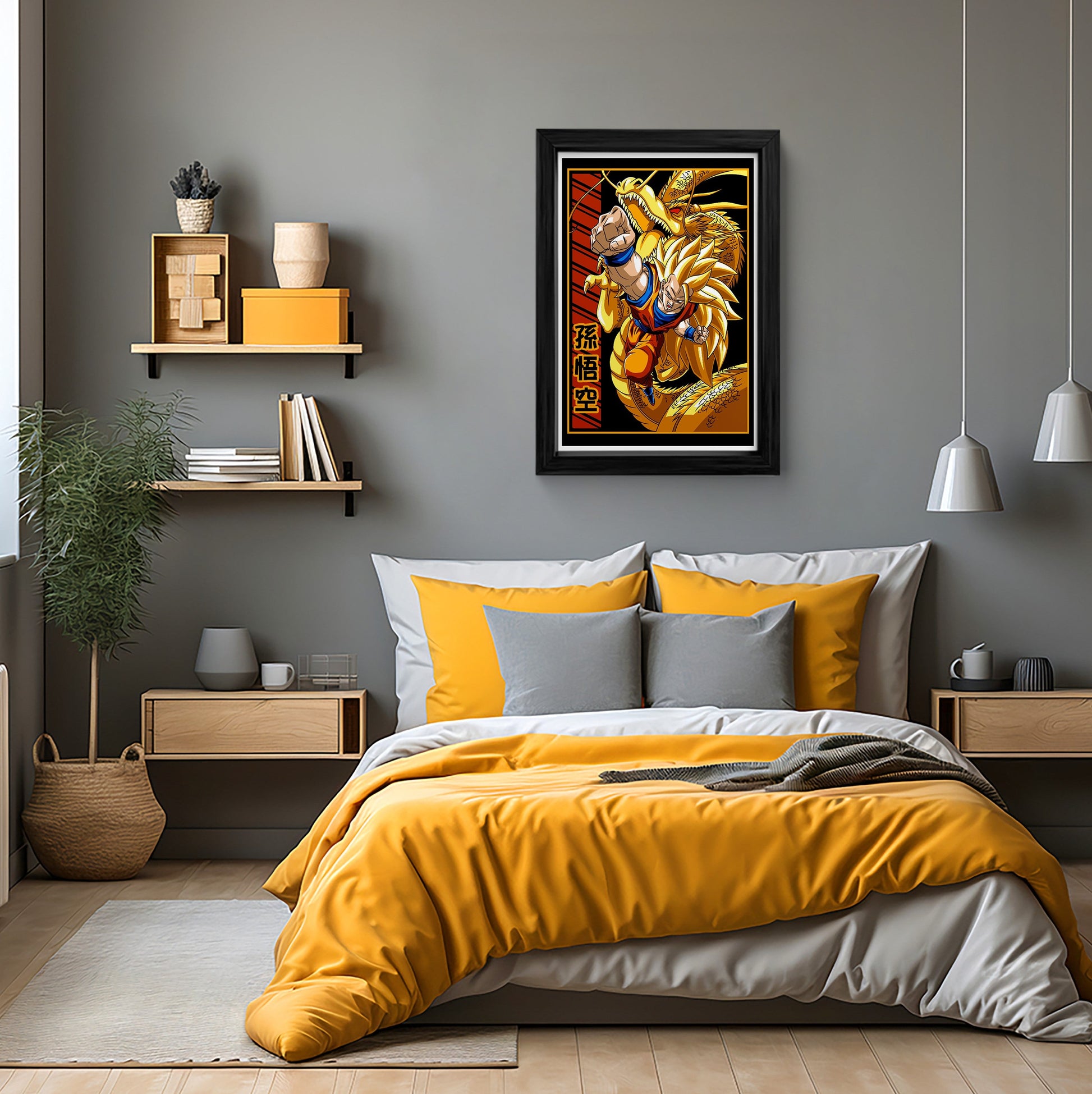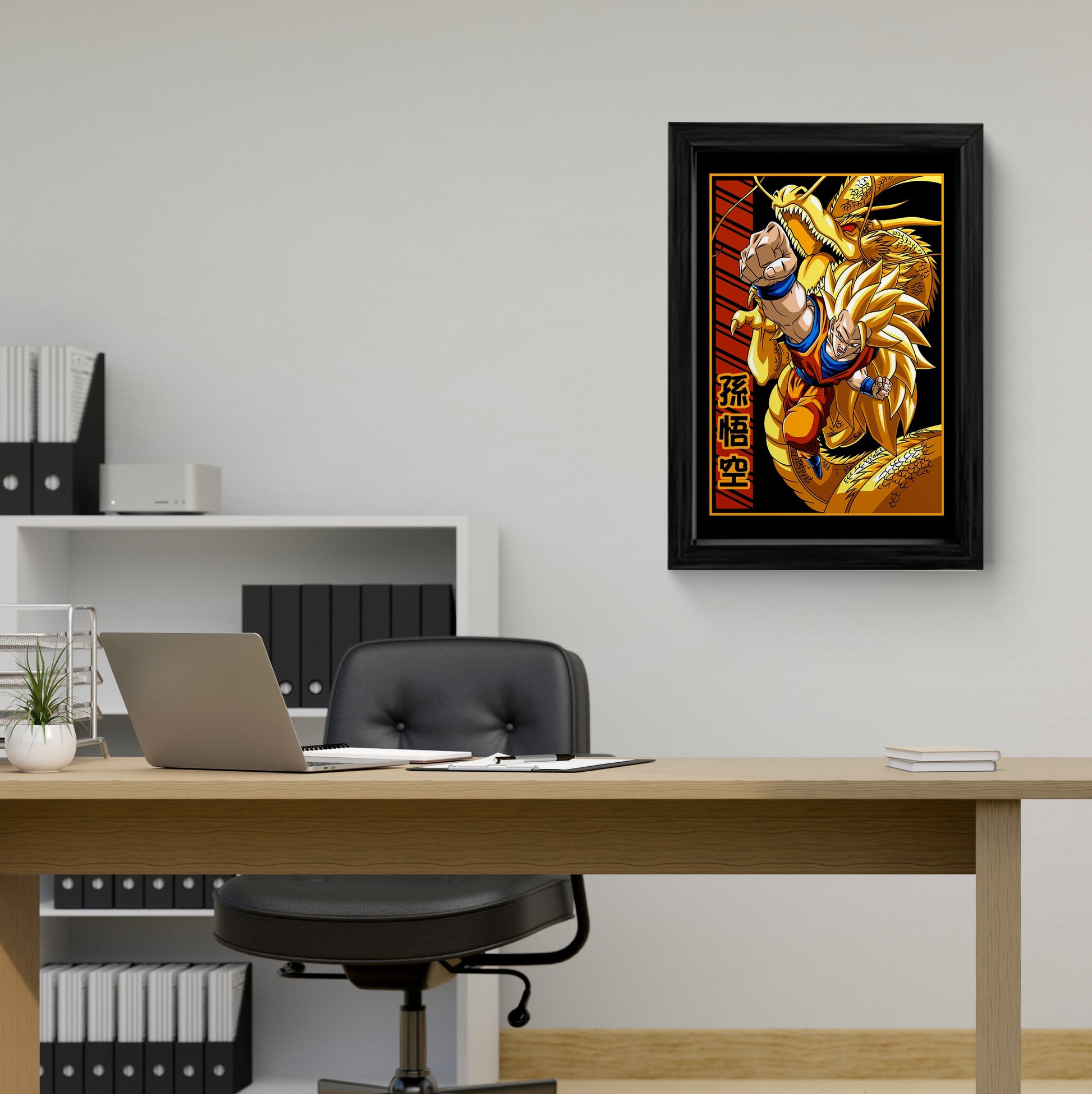 Bring the power of the Dragon Ball Z universe into your home with this stunning framed wall art. Featuring Son Goku in his iconic Super Saiyan form, charging towards Shenron, the Eternal Dragon, this piece is a must-have for any fan. The vibrant colors and dynamic pose capture the excitement and energy of this beloved anime series.