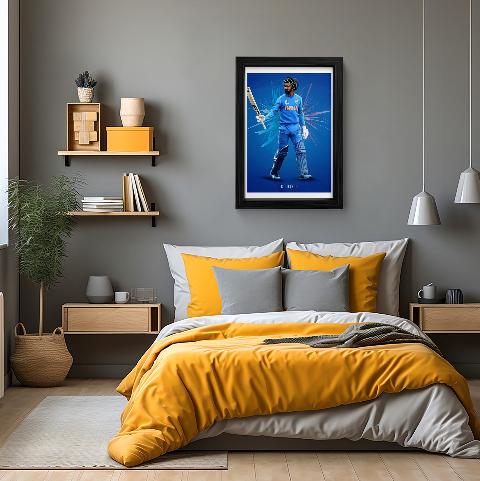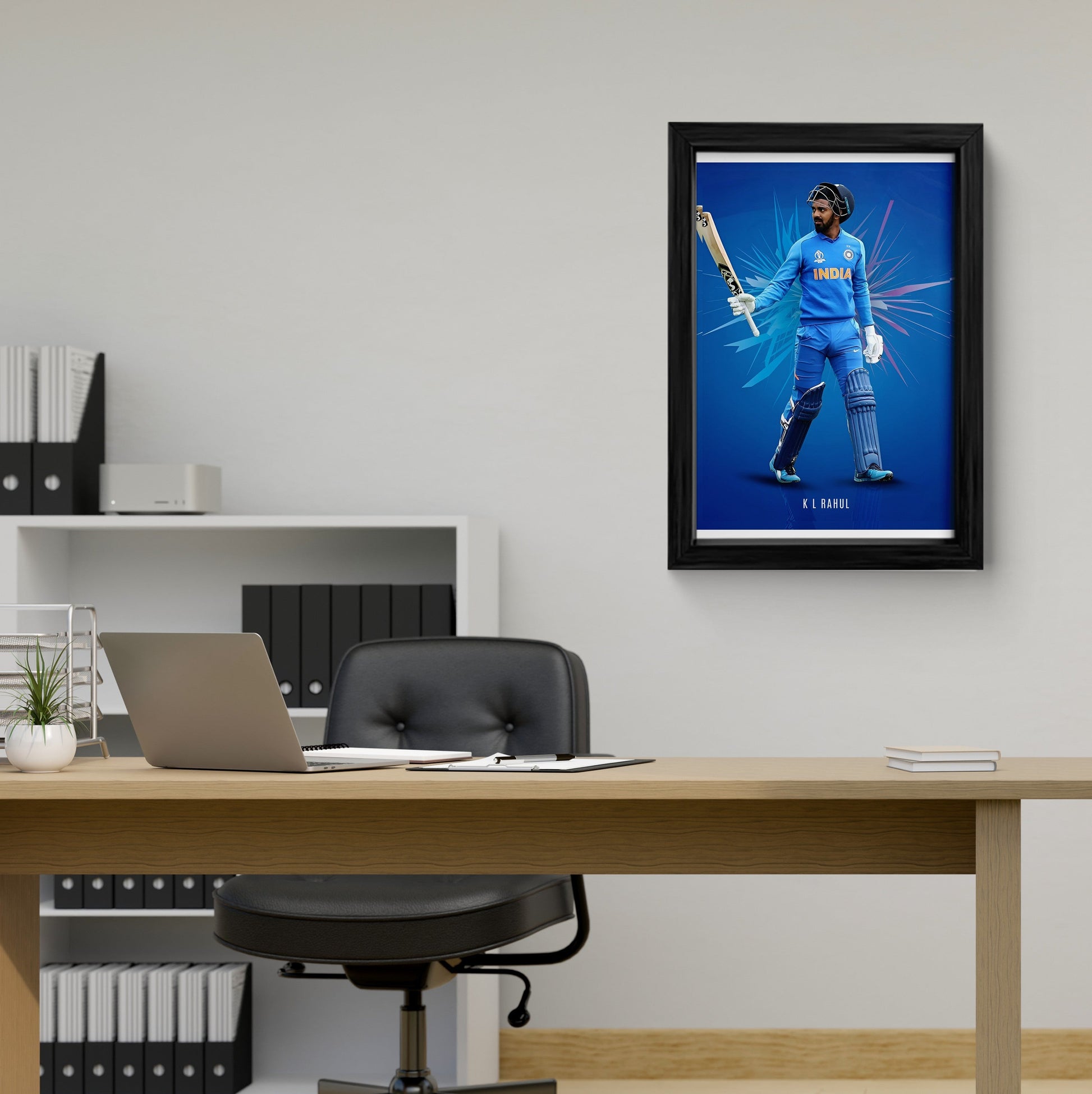 Elevate your space with this striking framed art print featuring KL Rahul, a renowned figure in Indian cricket. The canvas painting captures the dynamic essence of the sport with its vibrant blue backdrop and action-inspired design elements, making it an ideal piece for fans and collectors. This canvas wall art is not only a tribute to the athlete’s prowess but also a stylish addition to any wall art collection.