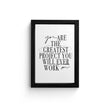 This exquisite framed art print transcends mere decoration – it’s a daily reminder of your intrinsic value. Against the stark white canvas, bold black scripted text delivers a powerful message: “You are the greatest project you will ever work on.” Ideal for those who appreciate the blend of motivational quotes with artistic expression, this canvas wall art seamlessly fits into various interior designs.