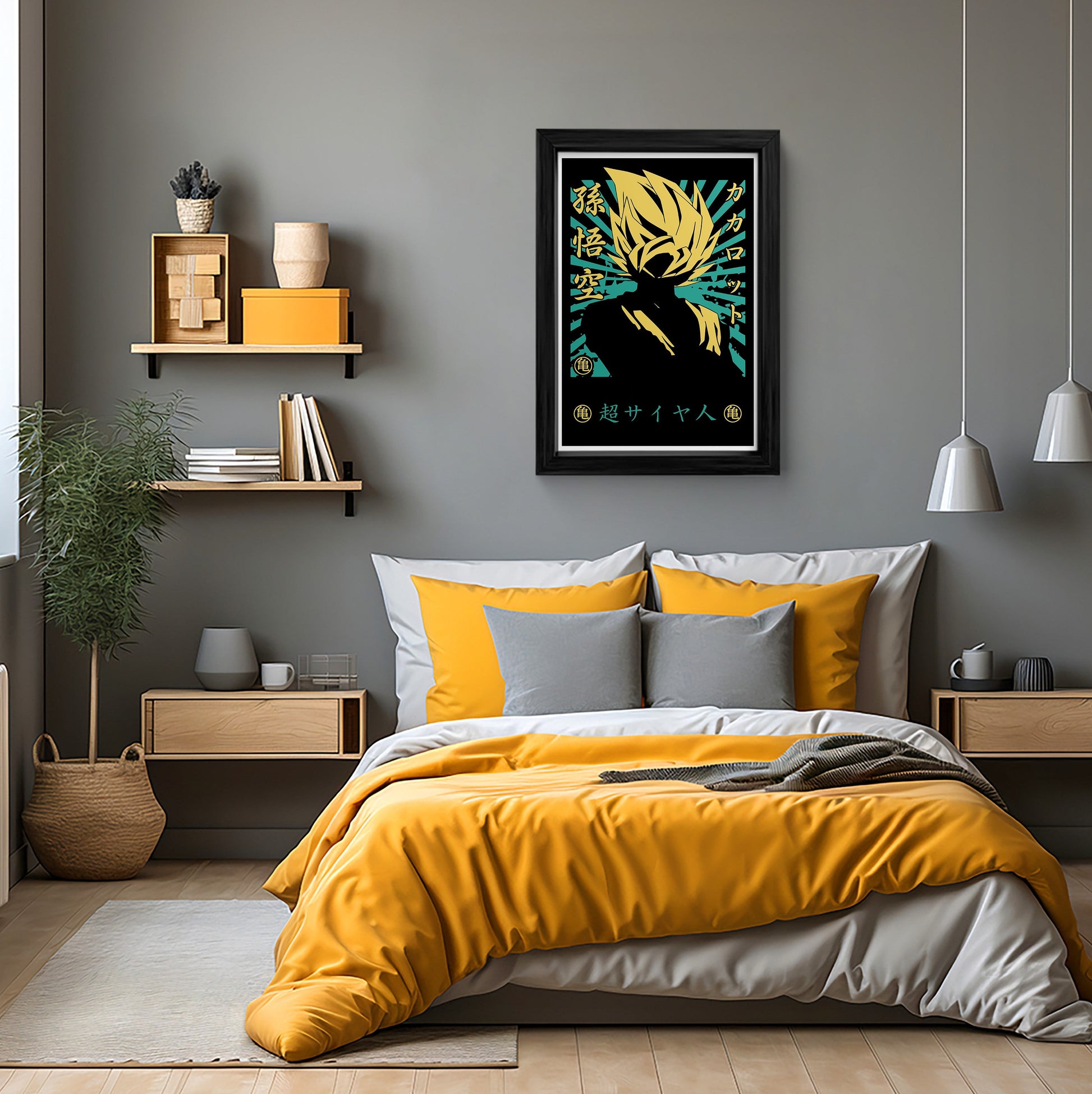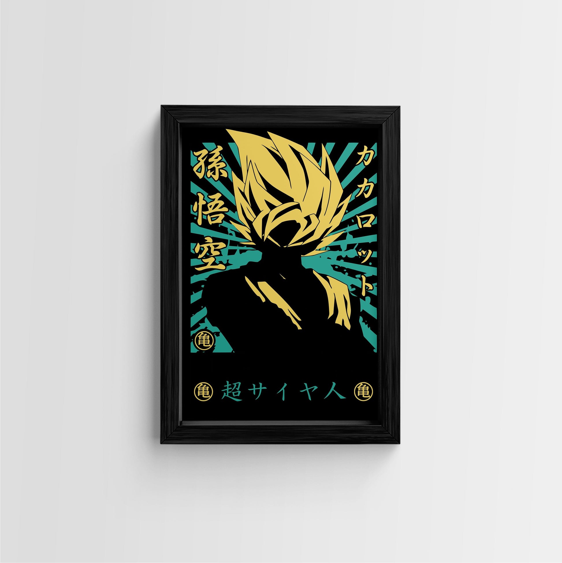 Elevate your space with this stunning framed wall art featuring Son Goku, the iconic protagonist of Dragon Ball. The vibrant yellow silhouette and teal background create a visually striking piece that's perfect for any fan. This high-quality canvas print comes ready to hang, making it easy to add a touch of anime style to your home or office.