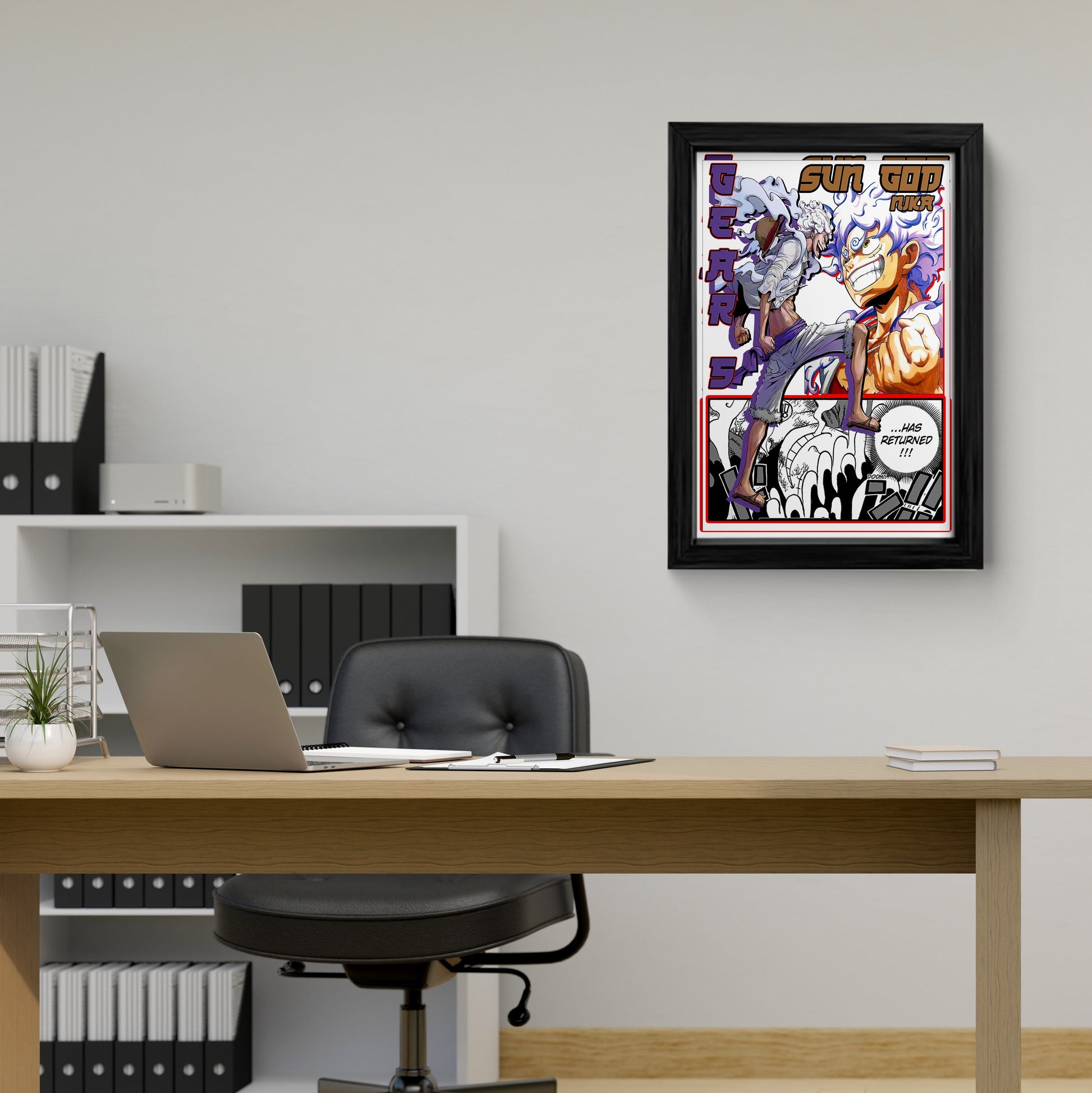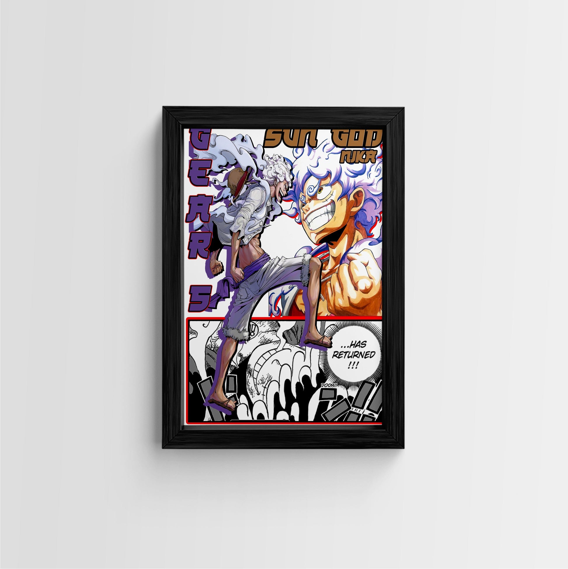 Gear 5 Luffy Sun God Nika Wall Art is a stunning framed canvas print perfect for any anime fan. This high-quality piece features the iconic One Piece character in his powerful Gear 5 form, ready to take on any challenge. Add a touch of excitement to your home decor with this vibrant and eye-catching piece.
