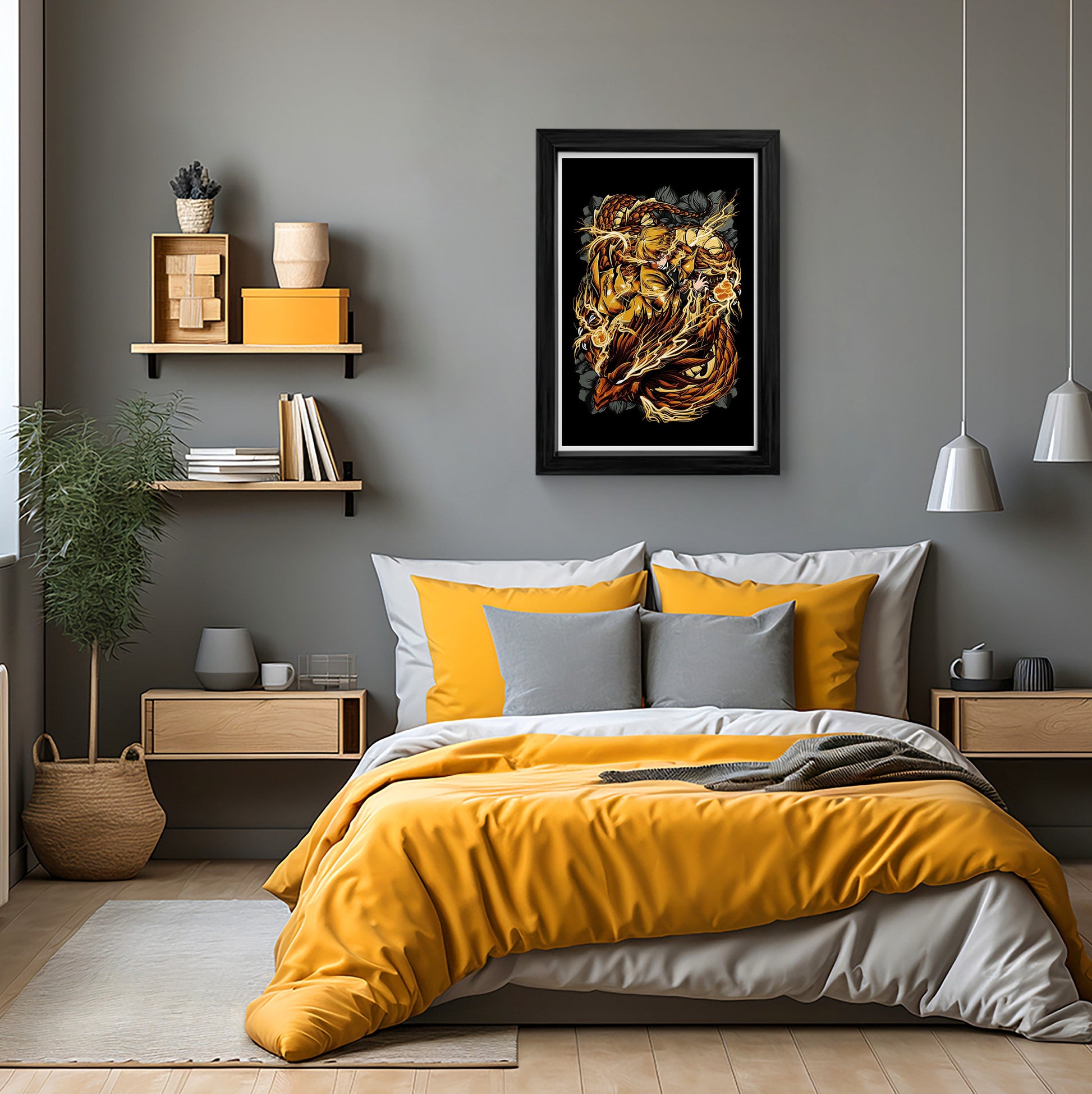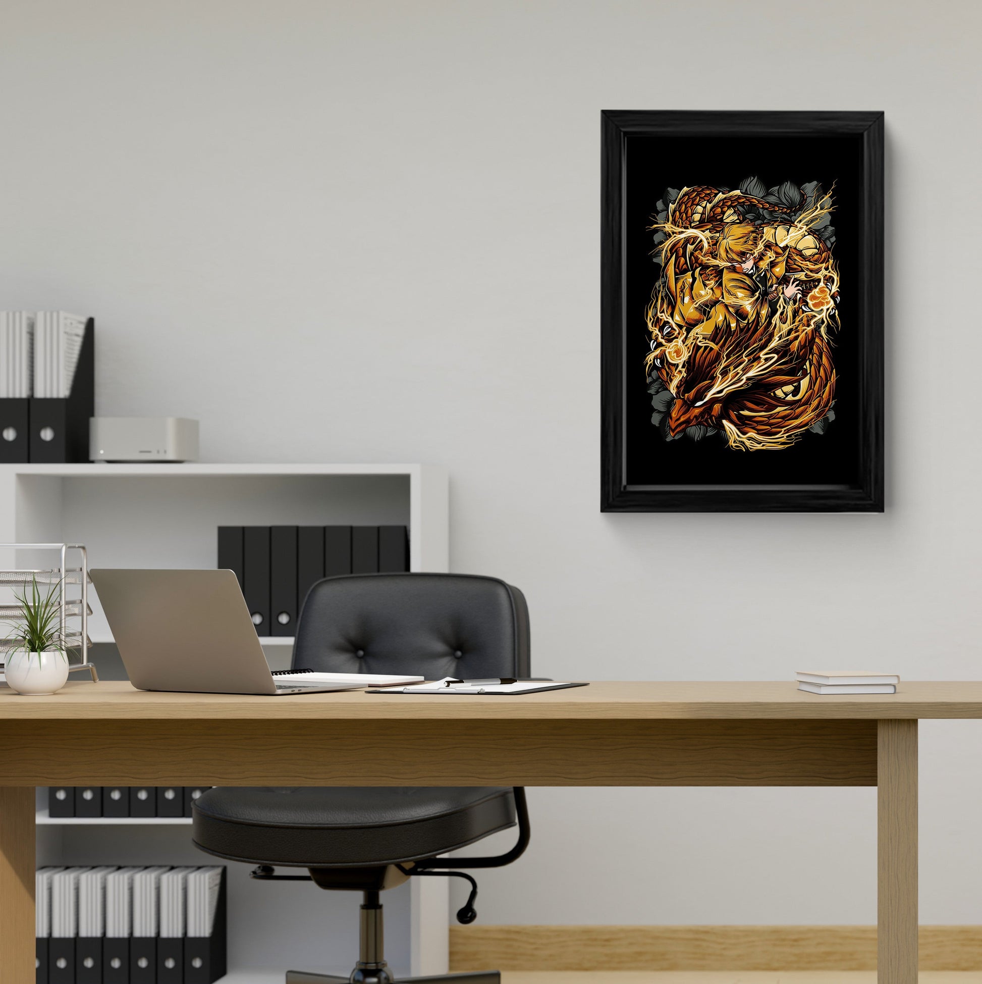 This captivating framed art print showcases a powerful warrior surrounded by two majestic golden dragons, emitting electrifying energy. A perfect addition to any fantasy-themed room, this canvas wall art is sure to ignite your imagination. The intricate details and vibrant colors make it a stunning centerpiece for your home.