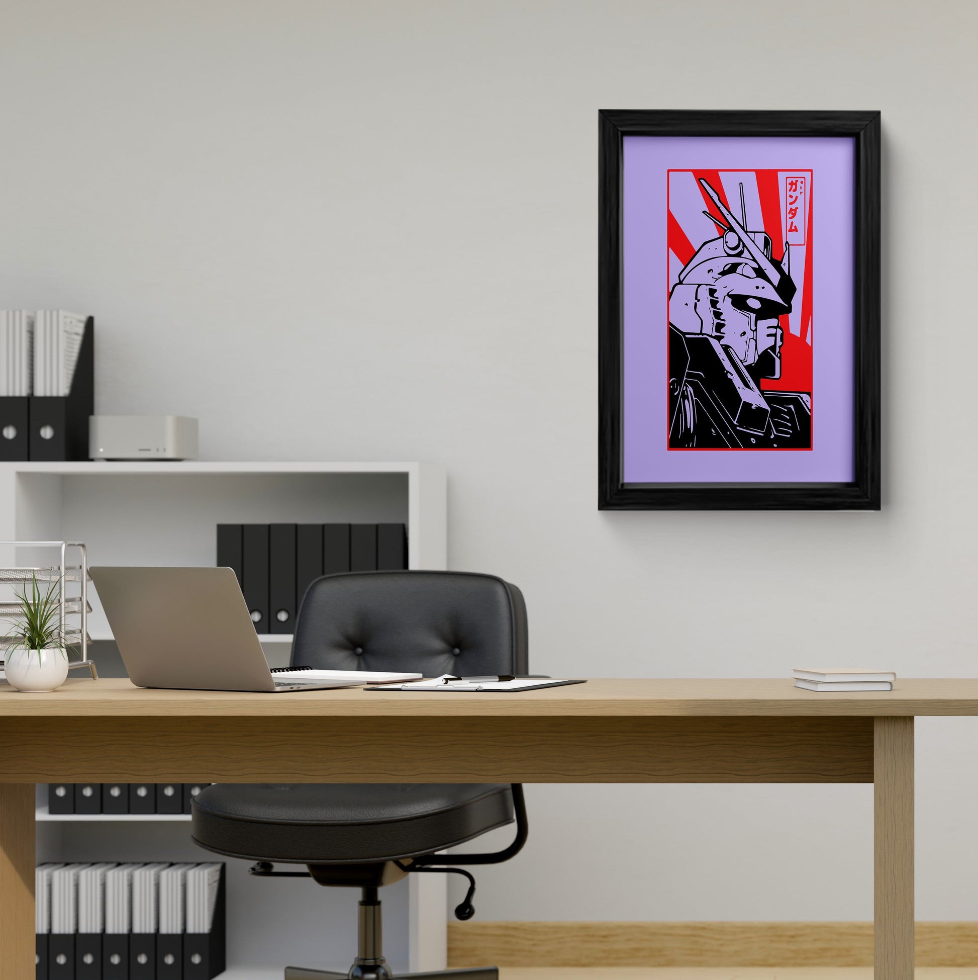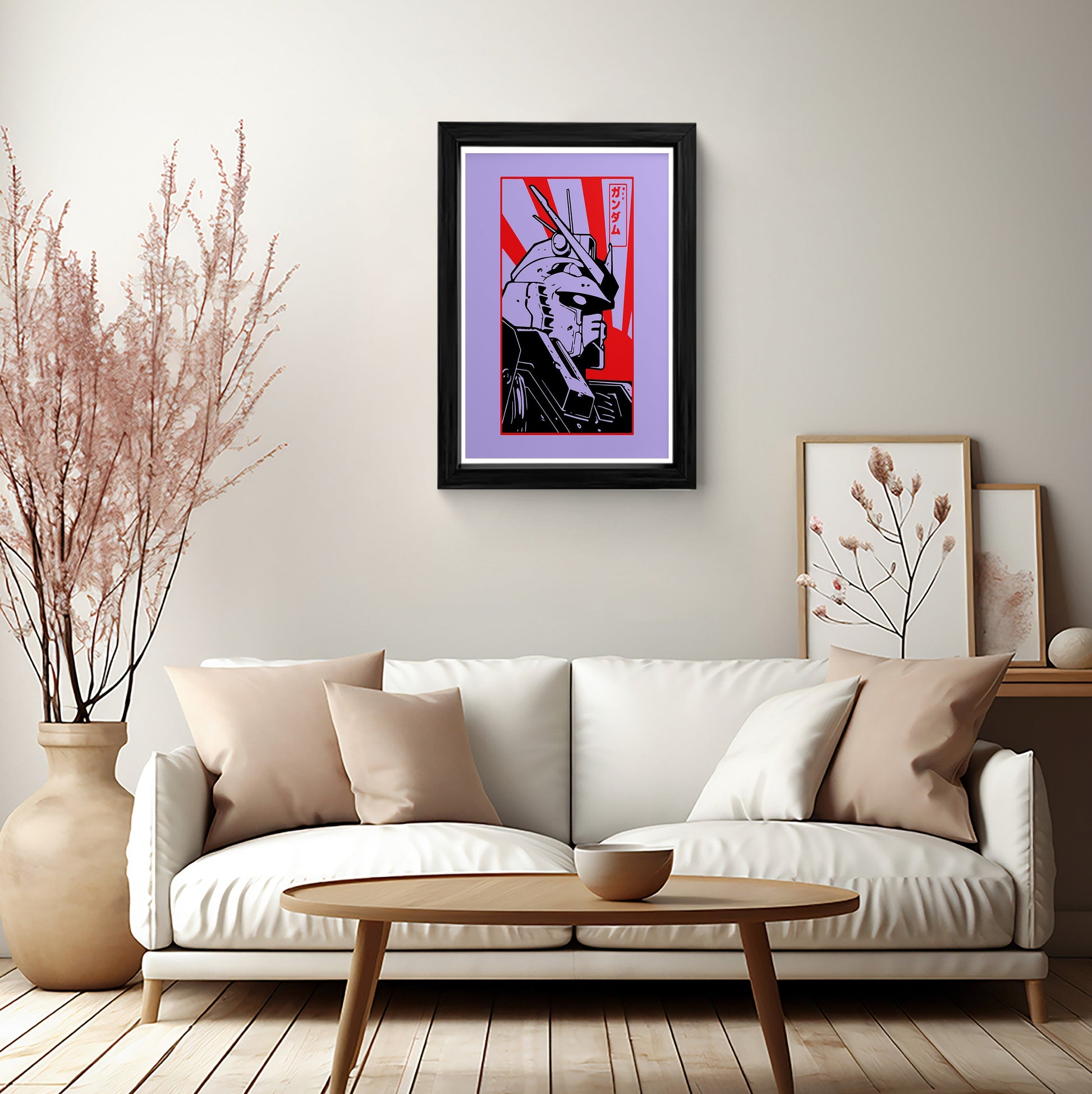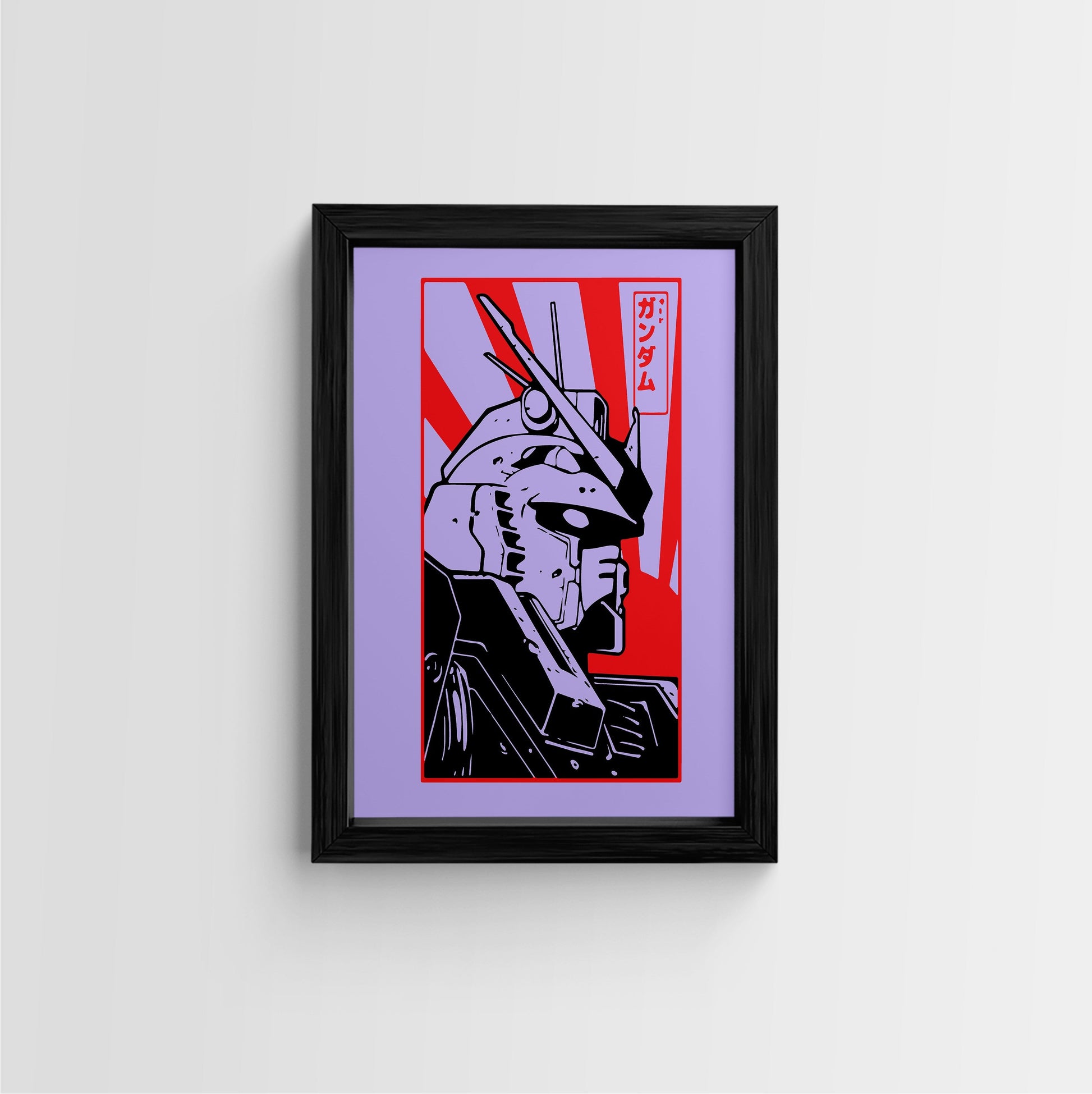 This sleek and minimalist wall art features the iconic Gundam RX-78-2 in a bold, black and white design against a vibrant purple background. The sunburst pattern adds a touch of Japanese culture, making it a perfect piece for any anime or sci-fi fan. Display this framed art print or canvas wall art in your living room, bedroom, or office to add a touch of futuristic style.