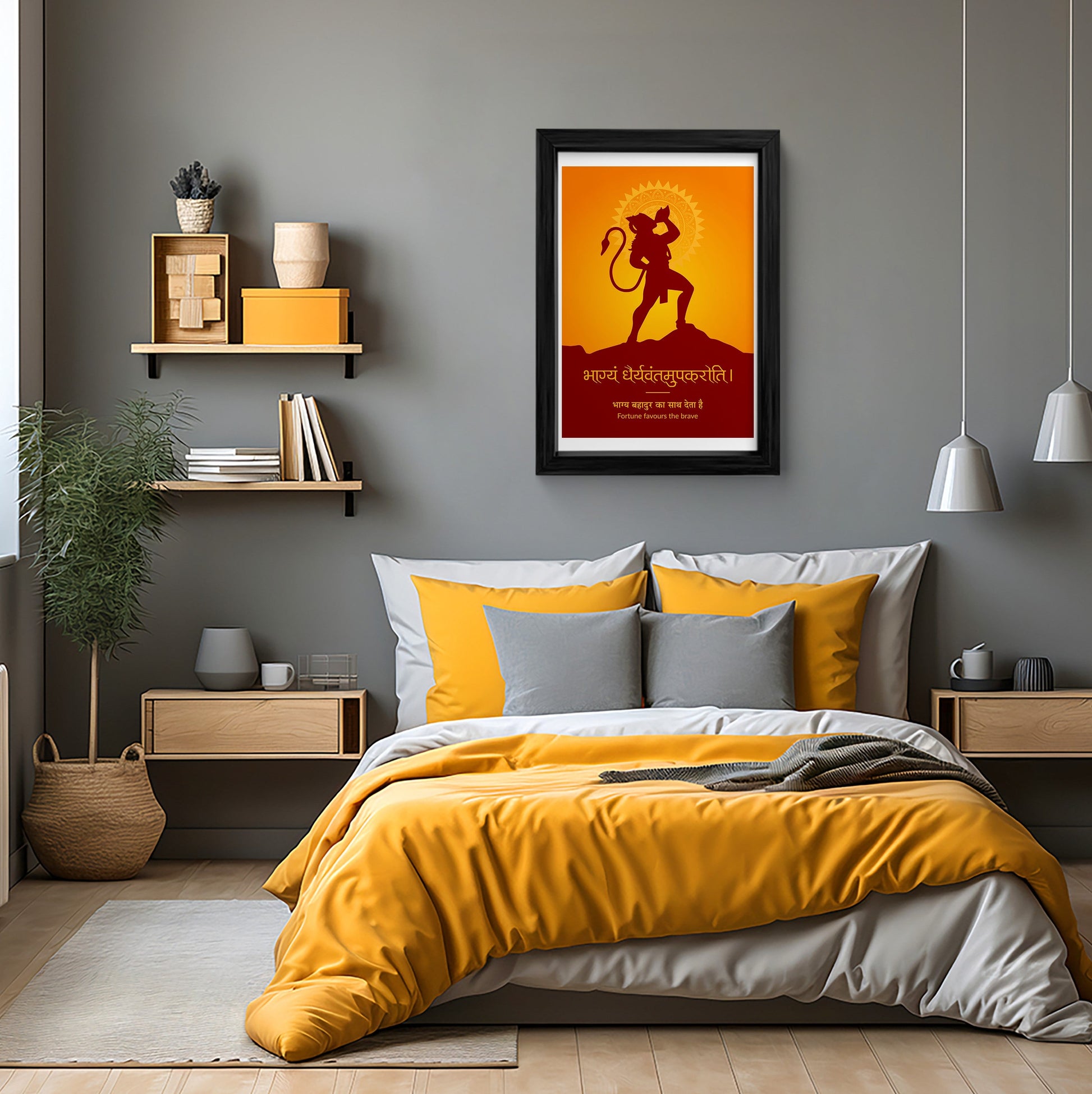 Elevate your space with this captivating Hanuman Chalisa wall art. Featuring a bold silhouette of Lord Hanuman against a vibrant orange background, this framed print is a perfect blend of tradition and modern design. The inspirational quote "Fortune favors the brave" in Sanskrit, Hindi, and English adds a touch of spiritual wisdom. Ideal for homes, offices, or meditation spaces, this canvas wall art is a beautiful and meaningful addition to any decor.