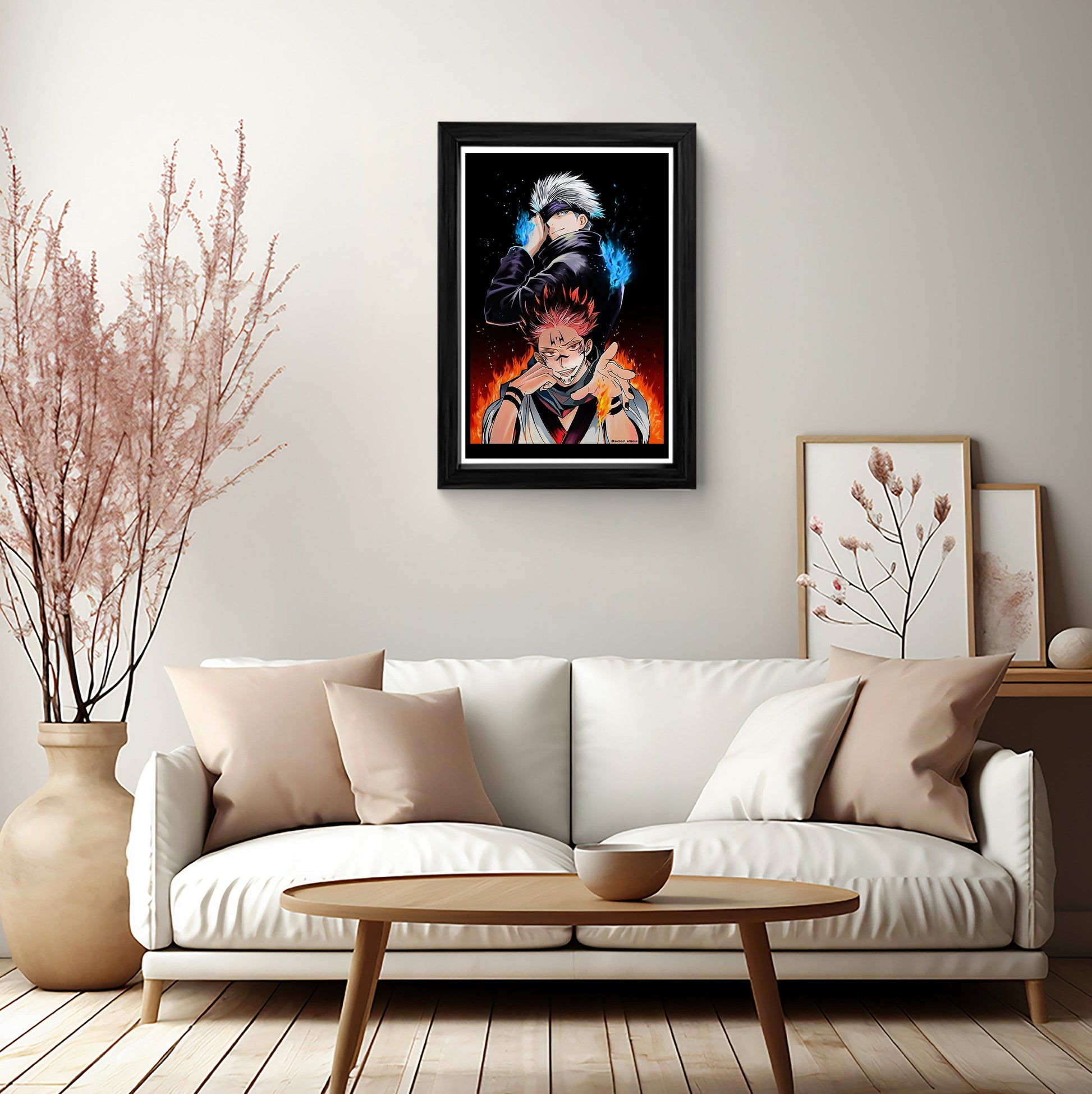 Elevate your space with this captivating framed art print featuring Satoru Gojo and Sukuna from the popular anime series Jujutsu Kaisen. The vibrant colors and dynamic poses capture the essence of these iconic characters. This high-quality canvas wall art is perfect for any fan and makes a stunning addition to your home or office decor.