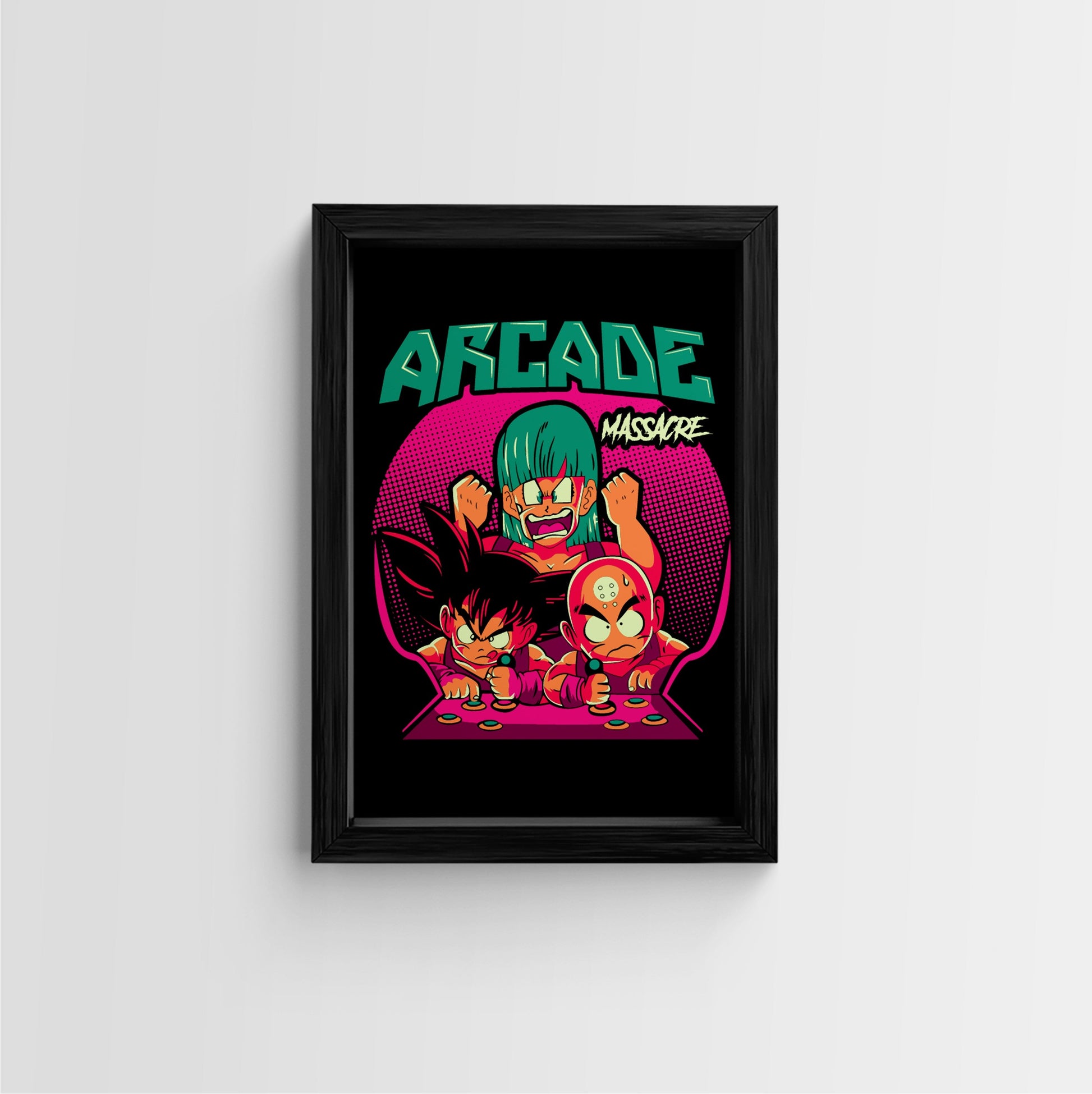 This vibrant Dragon Ball Z-inspired framed art print captures the iconic characters Goku, Krillin, and Bulma in a retro arcade setting. With the bold text "Arcade Massacre," this piece adds a touch of nostalgia and excitement to any room. Perfect for fans of anime, gaming, or pop culture, this canvas wall art is a must-have for your collection. Hang it in your living room, bedroom, or office to showcase your love for Dragon Ball Z.