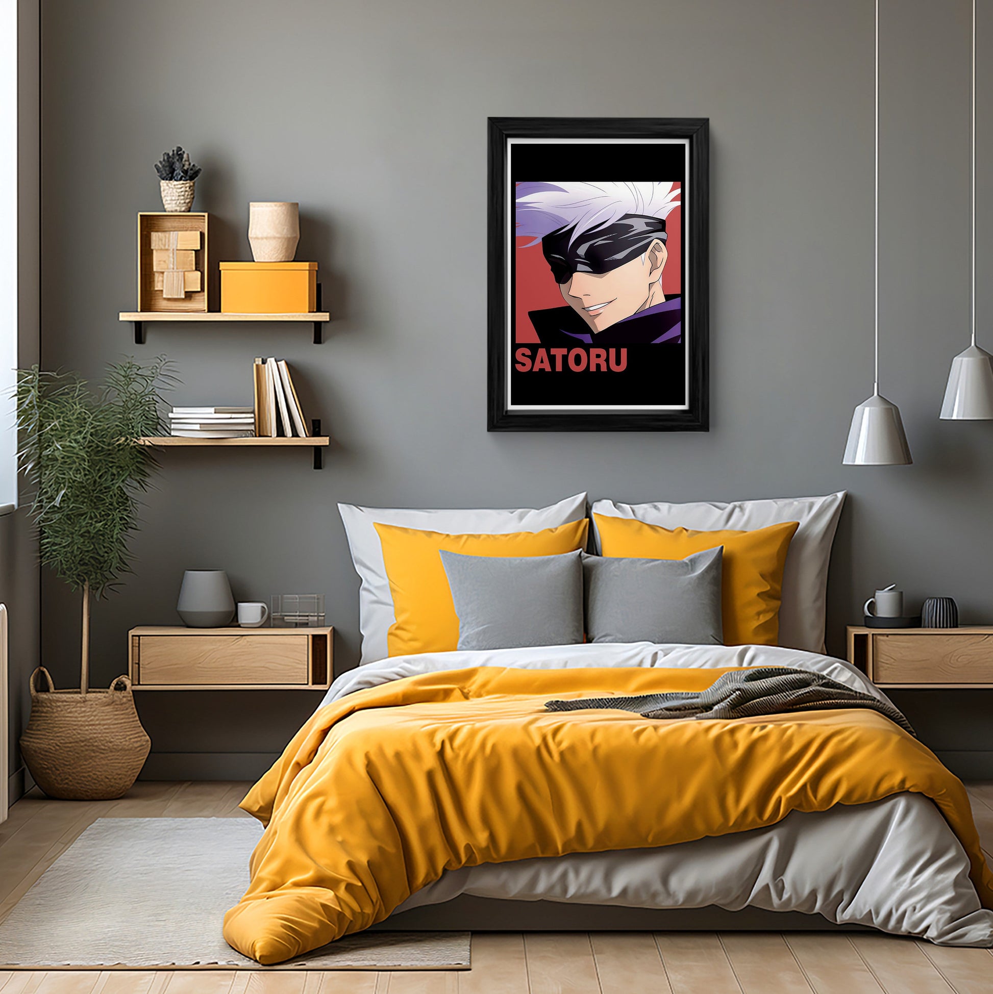 Elevate your space with the “Mystic Satoru” framed art print, a captivating piece of canvas wall art that blends modern aesthetics with enigmatic charm. This canvas painting features a striking abstract design, accented by bold colors and geometric shapes that draw the eye. The central figure, partially obscured for an air of mystery, adds a dynamic and intriguing element to this wall art. Perfect for contemporary interiors, this piece is sure to spark conversations and inspire imagination.
