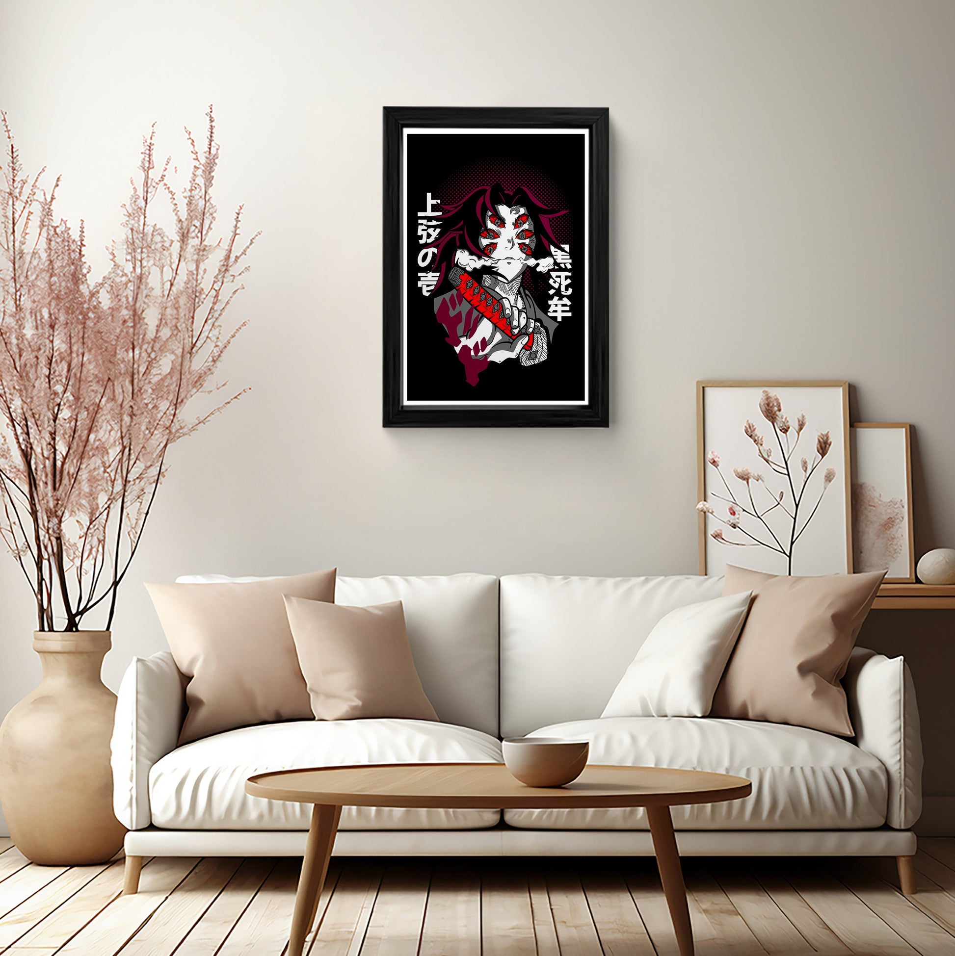 This framed art print features the powerful and menacing Muzan Kibutsuji, the main antagonist from the popular anime series Demon Slayer: Kimetsu no Yaiba. The image is rendered in a striking black and red color scheme, highlighting the character's sinister nature. A perfect addition to any fan's collection, this canvas wall art is sure to make a bold statement in your home.