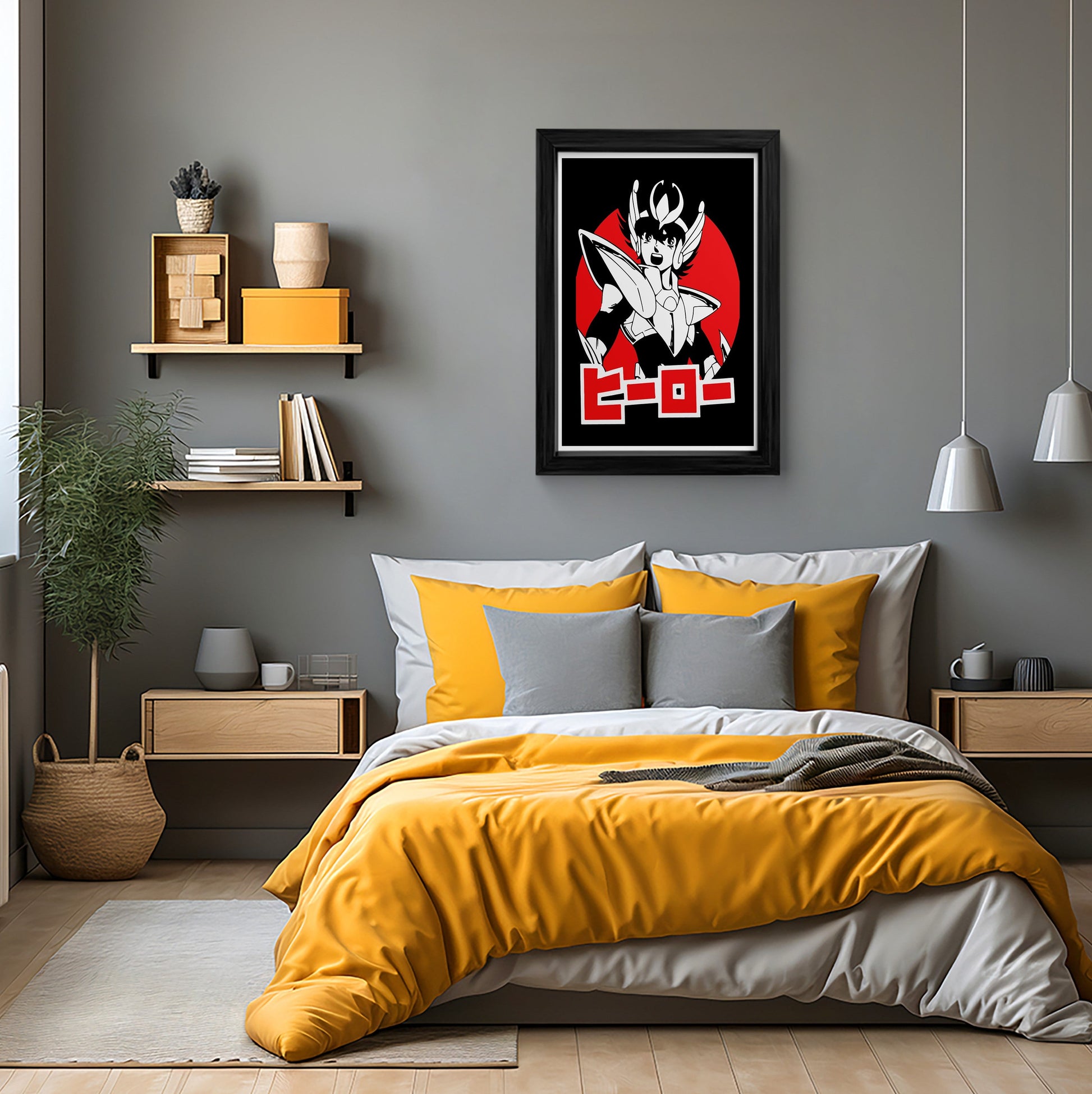 This stunning framed art print showcases the iconic Pegasus Seiya from the beloved Saint Seiya series. The bold, minimalist design features Seiya in a striking red circle, surrounded by a black background. Perfect for any fan of anime or classic manga, this canvas wall art piece is sure to add a touch of nostalgia and excitement to your home decor. Hang it in your living room, bedroom, or anywhere you want to display your love for the Knights of the Zodiac.