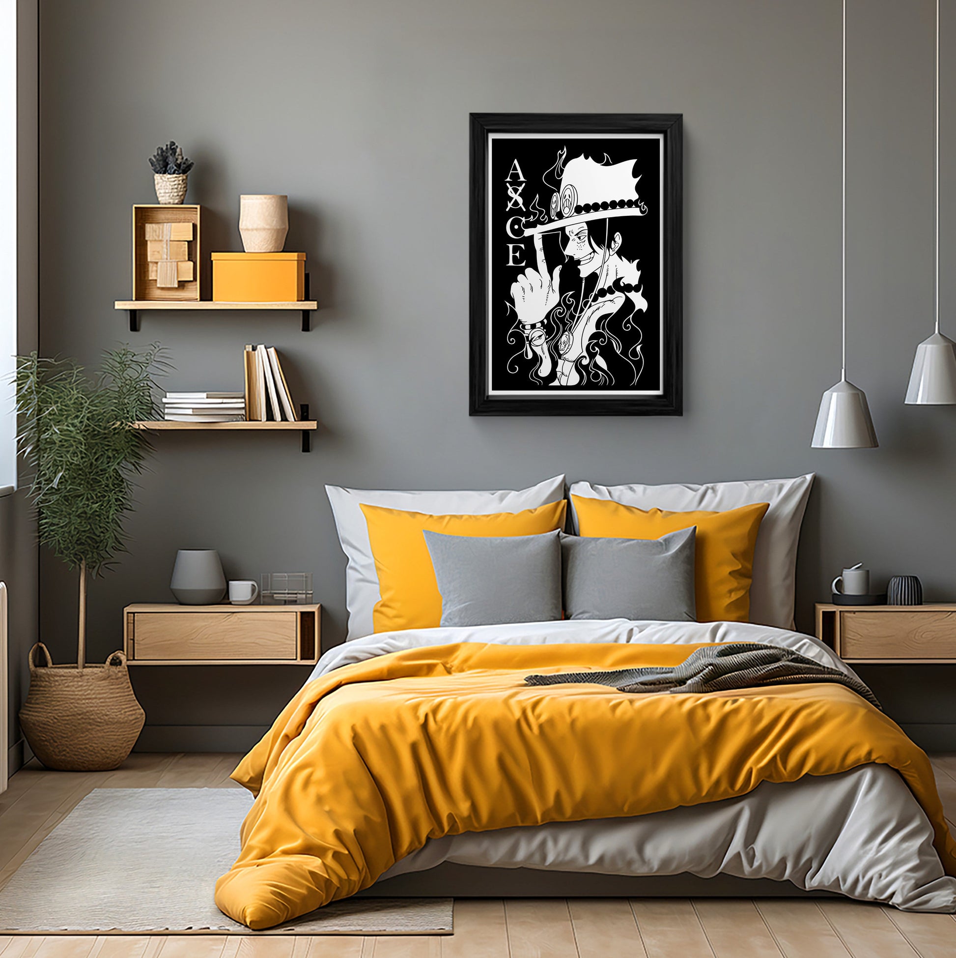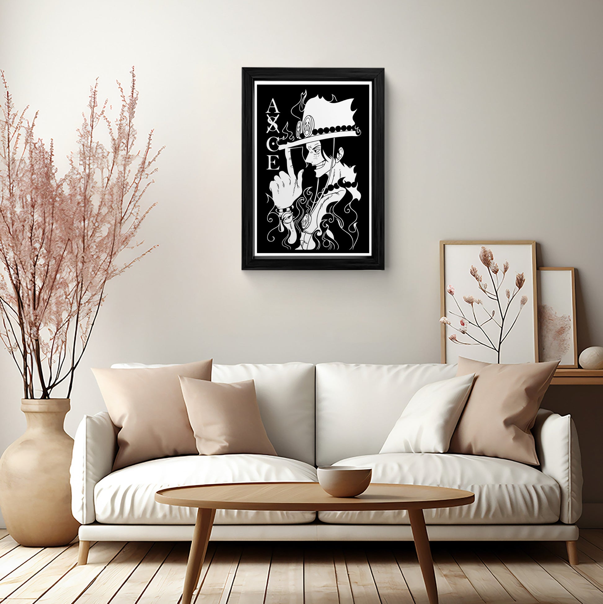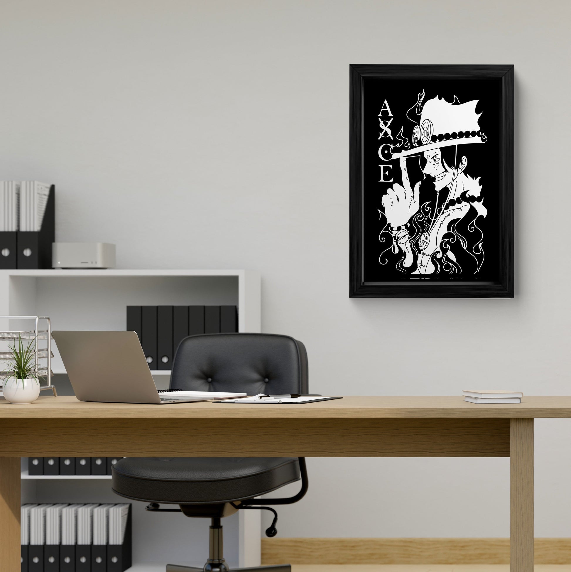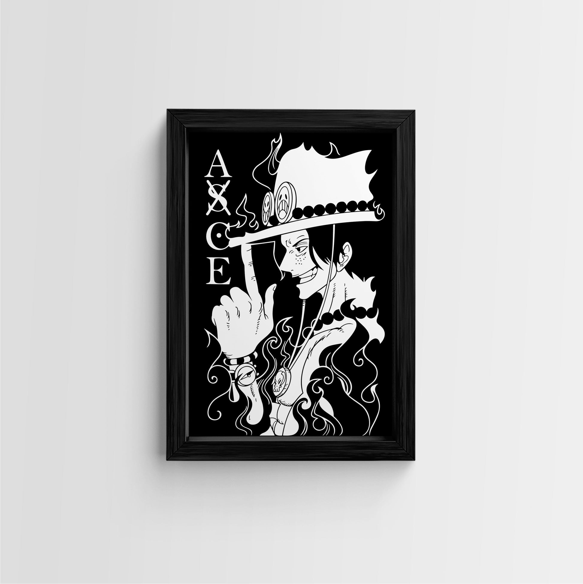 Elevate your space with this stunning black and white framed art print featuring Portgas D. Ace, the fiery-haired pirate from One Piece. This high-quality canvas wall art is a must-have for any anime fan, showcasing Ace's iconic smirk and signature flame tattoos. Perfect for bedrooms, living rooms, or offices, this piece adds a touch of adventure and style to any room.