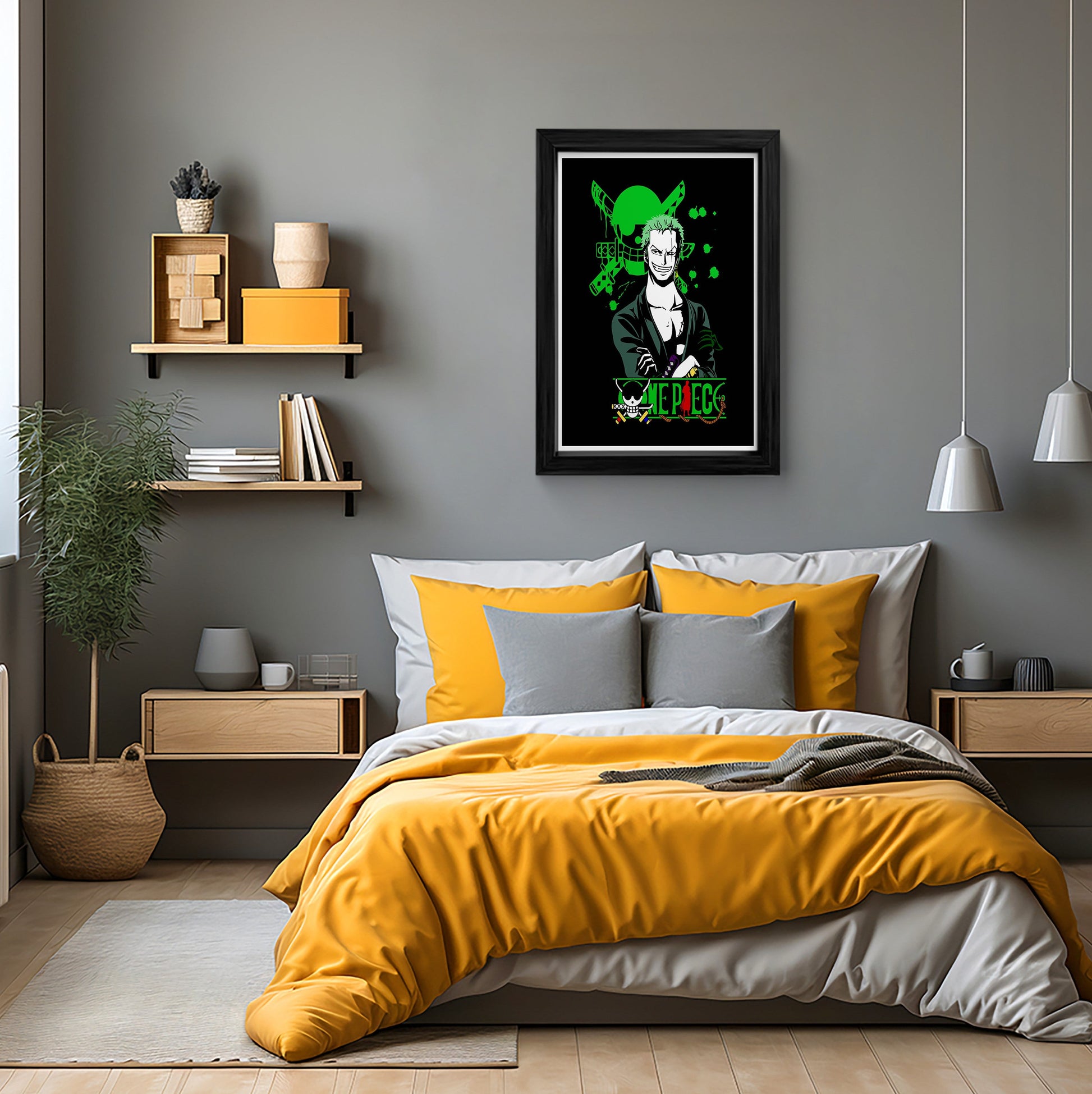 This stunning framed wall art features the iconic Roronoa Zoro from the popular anime and manga series, One Piece. Zoro, known for his incredible swordsmanship skills, is depicted in a dynamic pose with his three swords, Enma, Sandai Kitetsu, and Wado Ichimonji. Perfect for any One Piece fan, this high-quality canvas wall art will add a touch of adventure and excitement to your home decor.