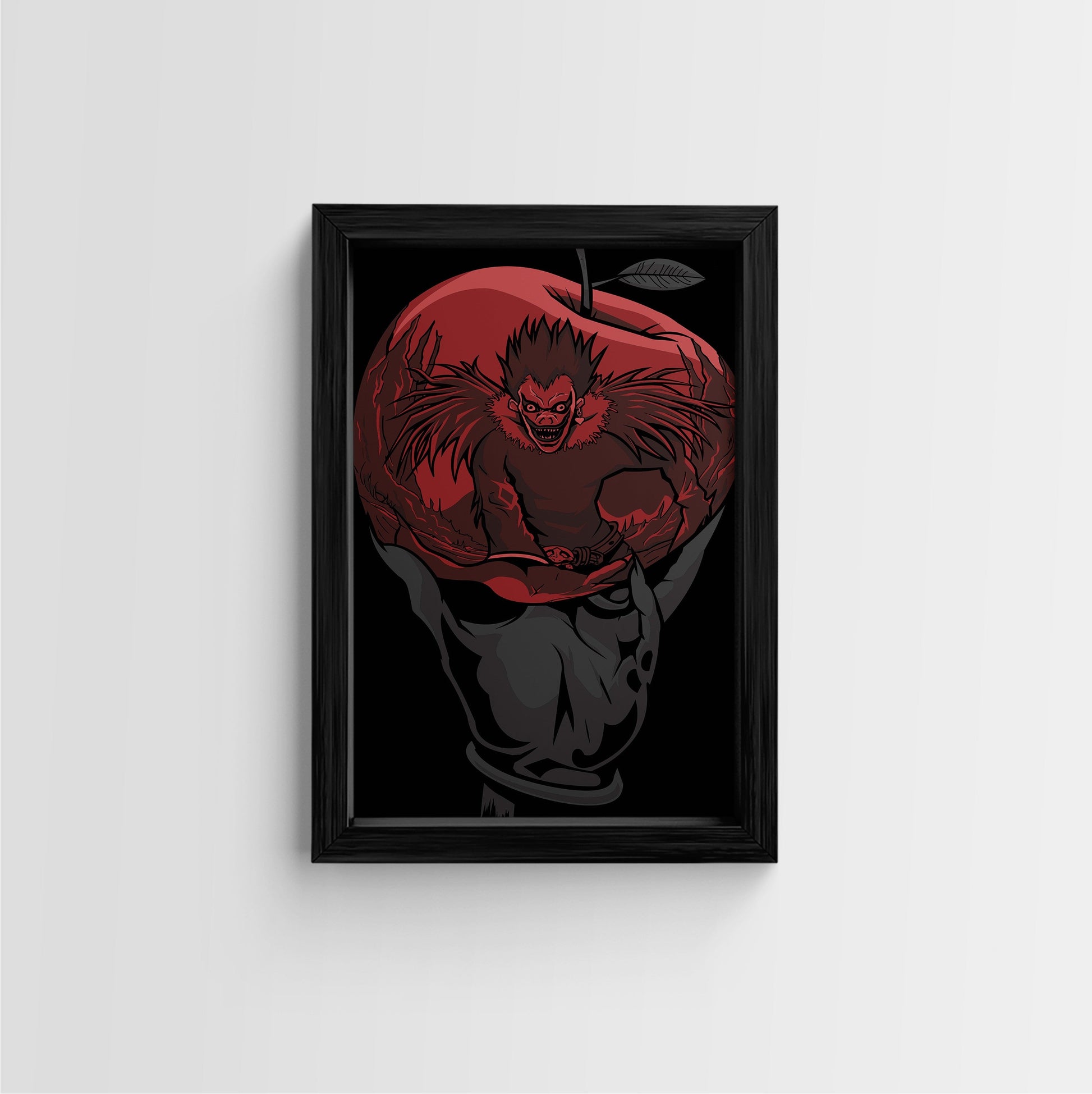Elevate your space with this captivating Ryuk Apple wall art, a tribute to the iconic Death Note character. The framed art print features a detailed illustration of Ryuk emerging from a red apple, perfect for fans and collectors alike. This high-quality canvas wall art adds a touch of intrigue and style to any room.