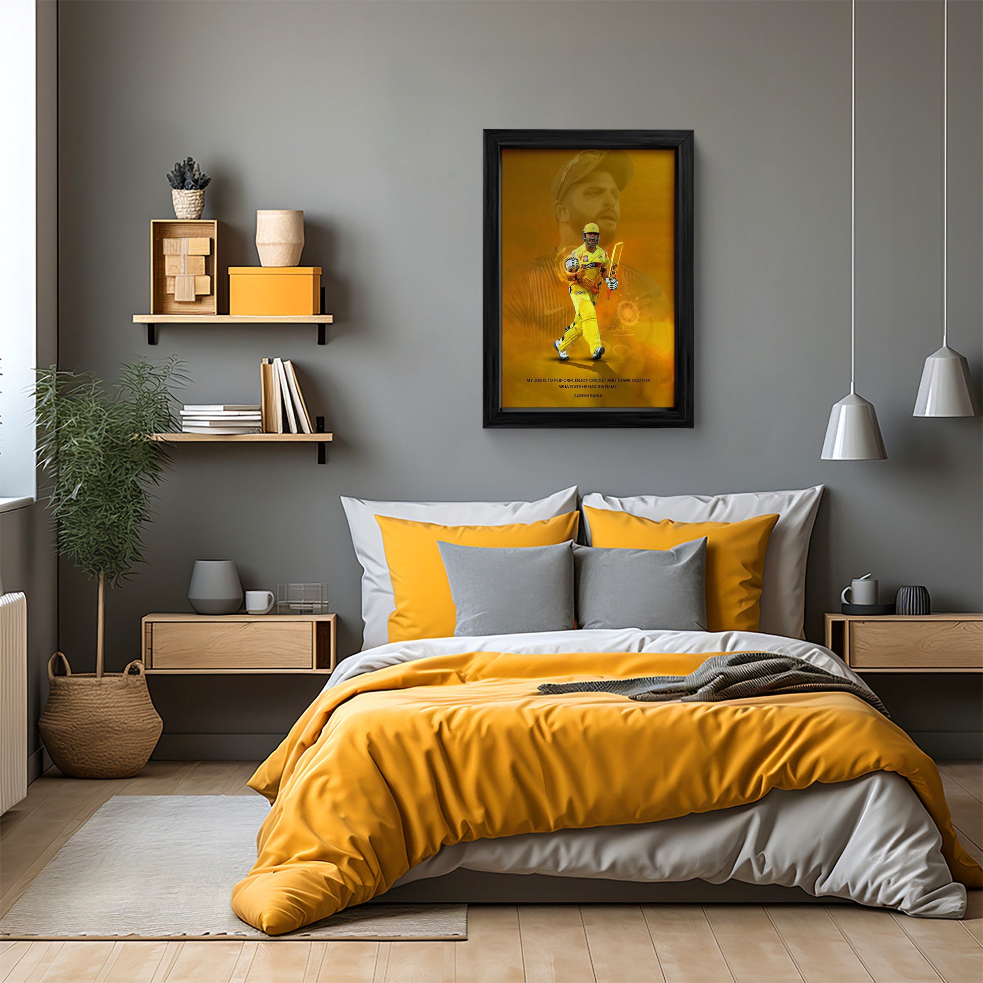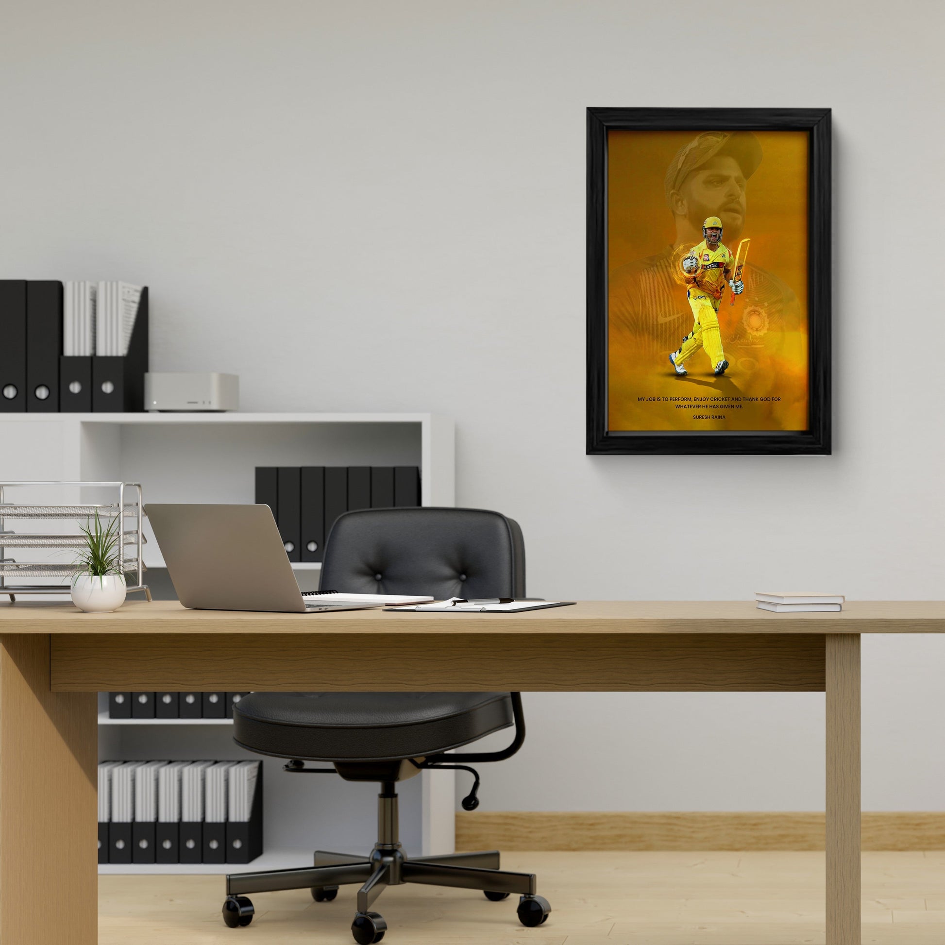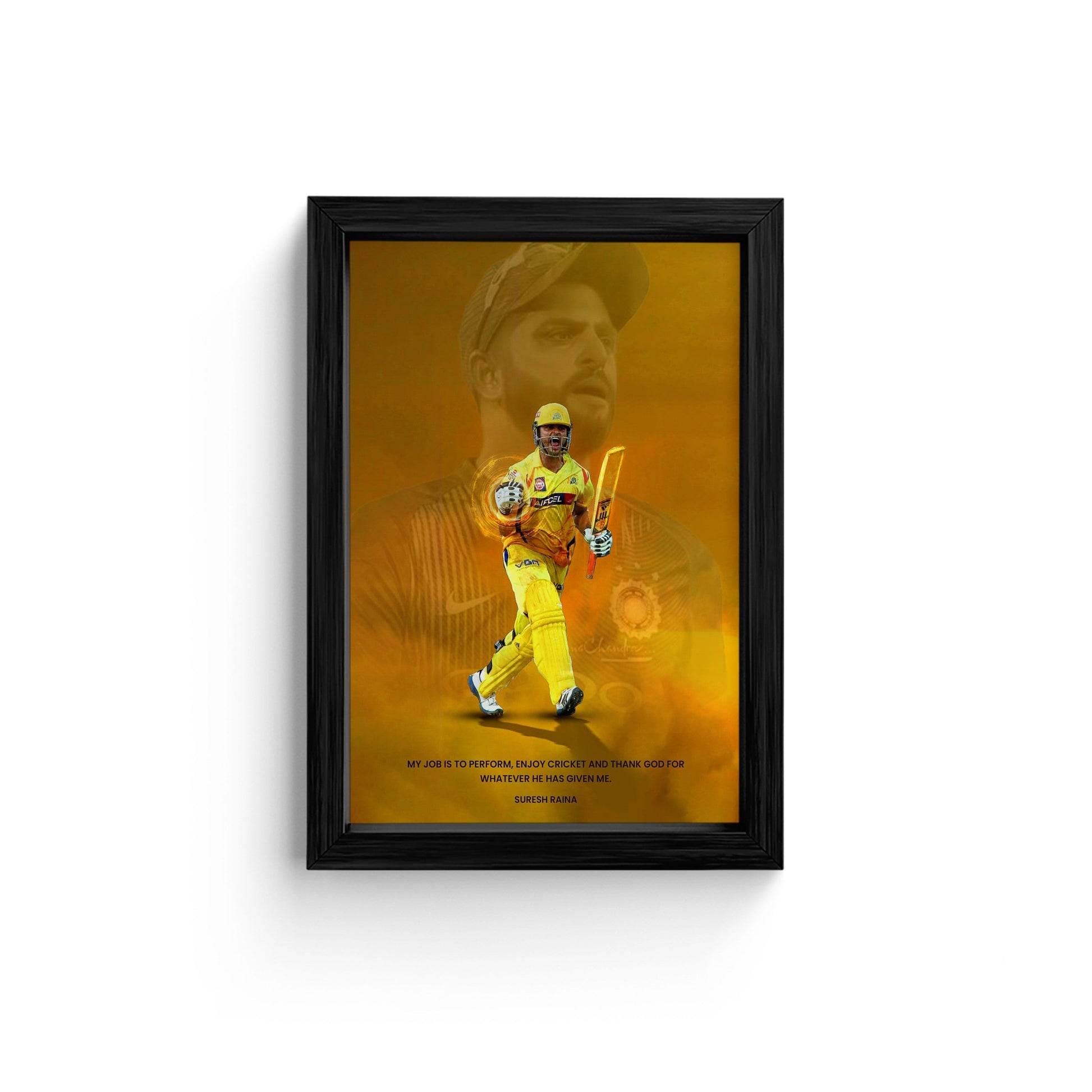 Elevate your space with this stunning framed art print featuring Suresh Raina, the iconic Indian cricketer. His inspiring quote, "My job is to perform, enjoy cricket and thank God for whatever He has given me," captures his spirit and dedication to the game. This high-quality canvas wall art is a perfect addition to any sports enthusiast's home or office.