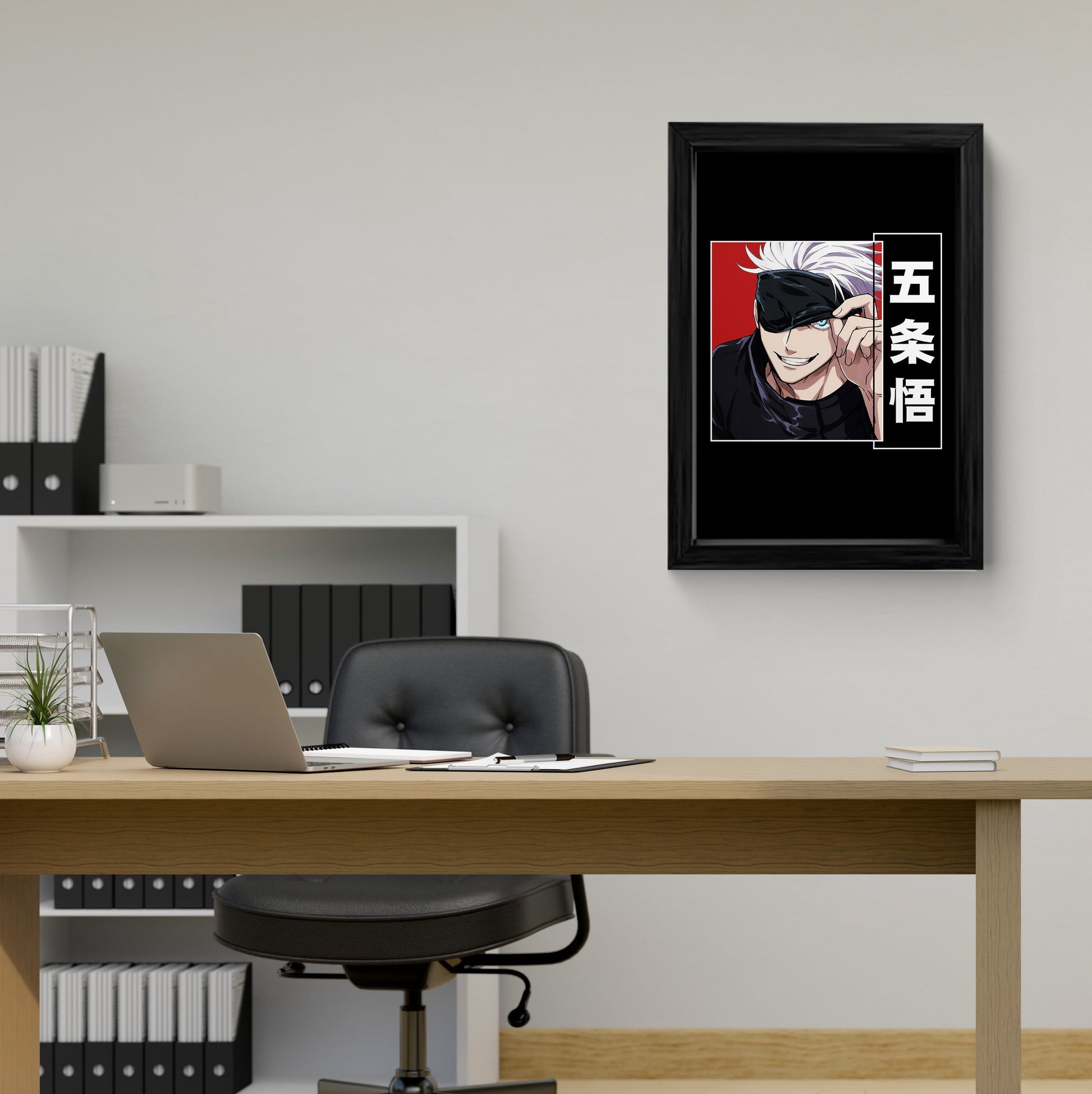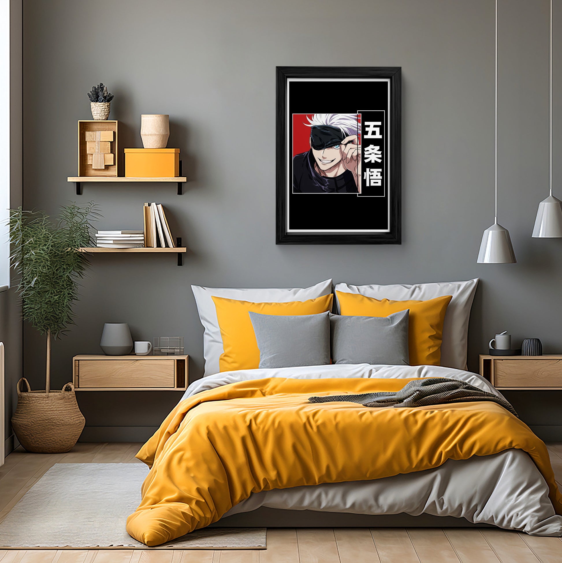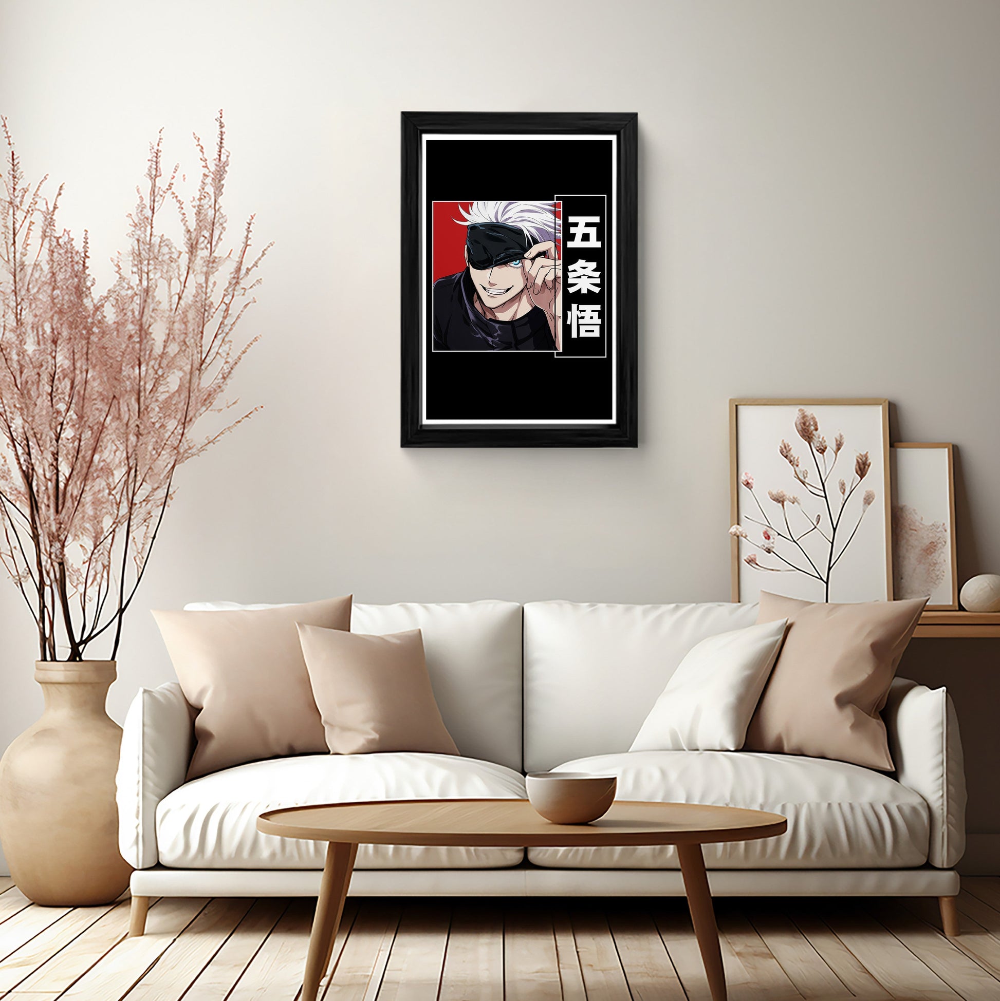 Elevate your space with this stunning framed art print of Satoru Gojo from Jujutsu Kaisen. Featuring a captivating portrait in a sleek black frame, this piece is a must-have for anime fans. Perfect for bedrooms, living rooms, or offices, this canvas wall art adds a touch of style and intrigue.