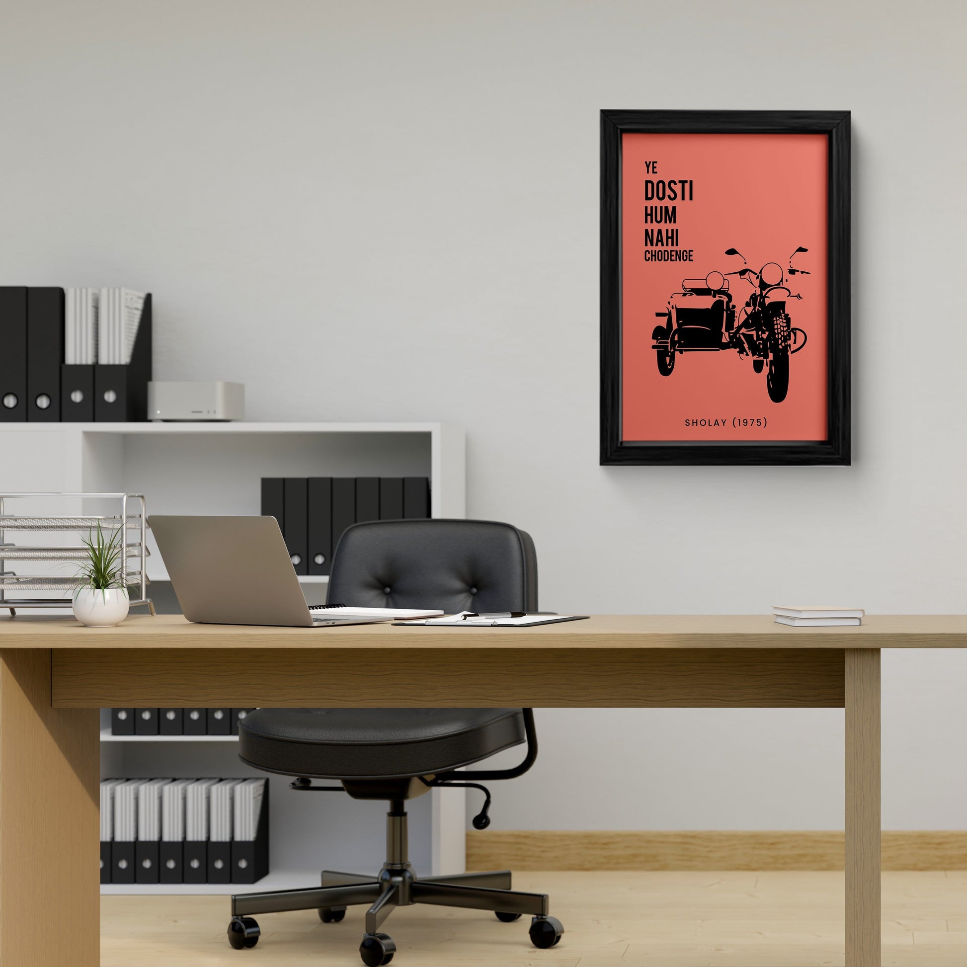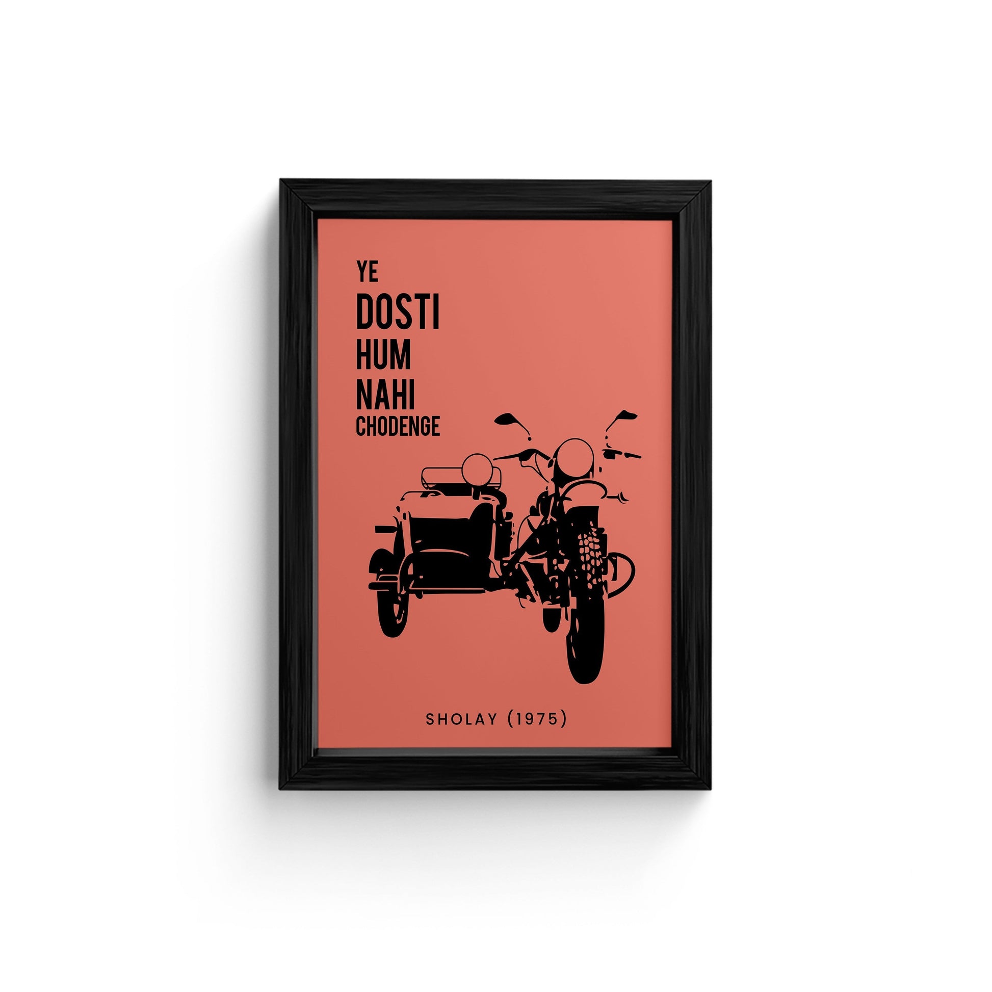 This framed art print features a powerful quote from the classic Bollywood movie, Sholay, that celebrates the enduring bond of friendship. The iconic image of a motorcycle with a sidecar symbolizes the journey of life and the unwavering support of true friends. Perfect for adding a touch of nostalgia and inspiration to your home decor, this piece is a must-have for any Sholay fan or anyone who appreciates timeless friendship.