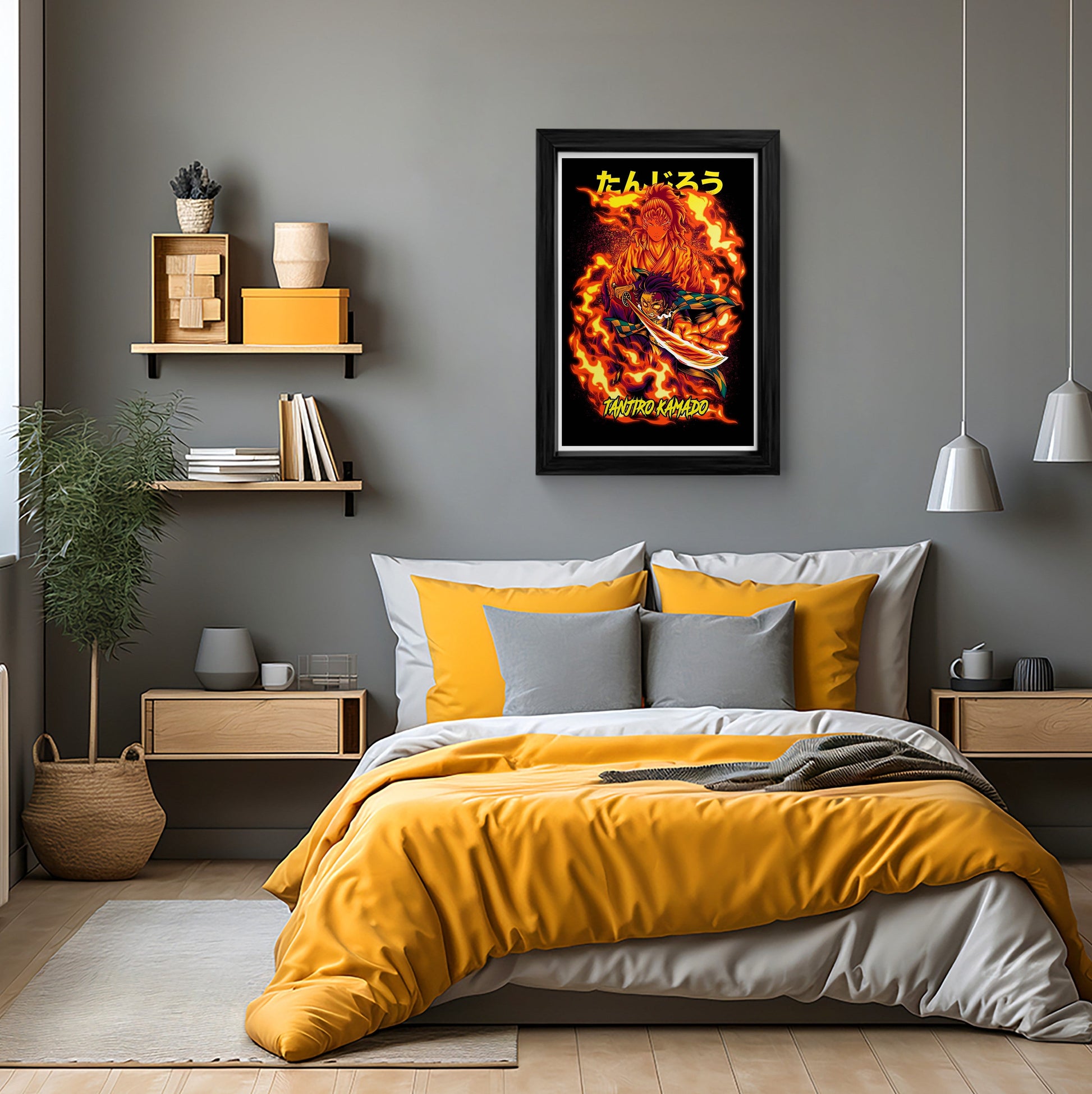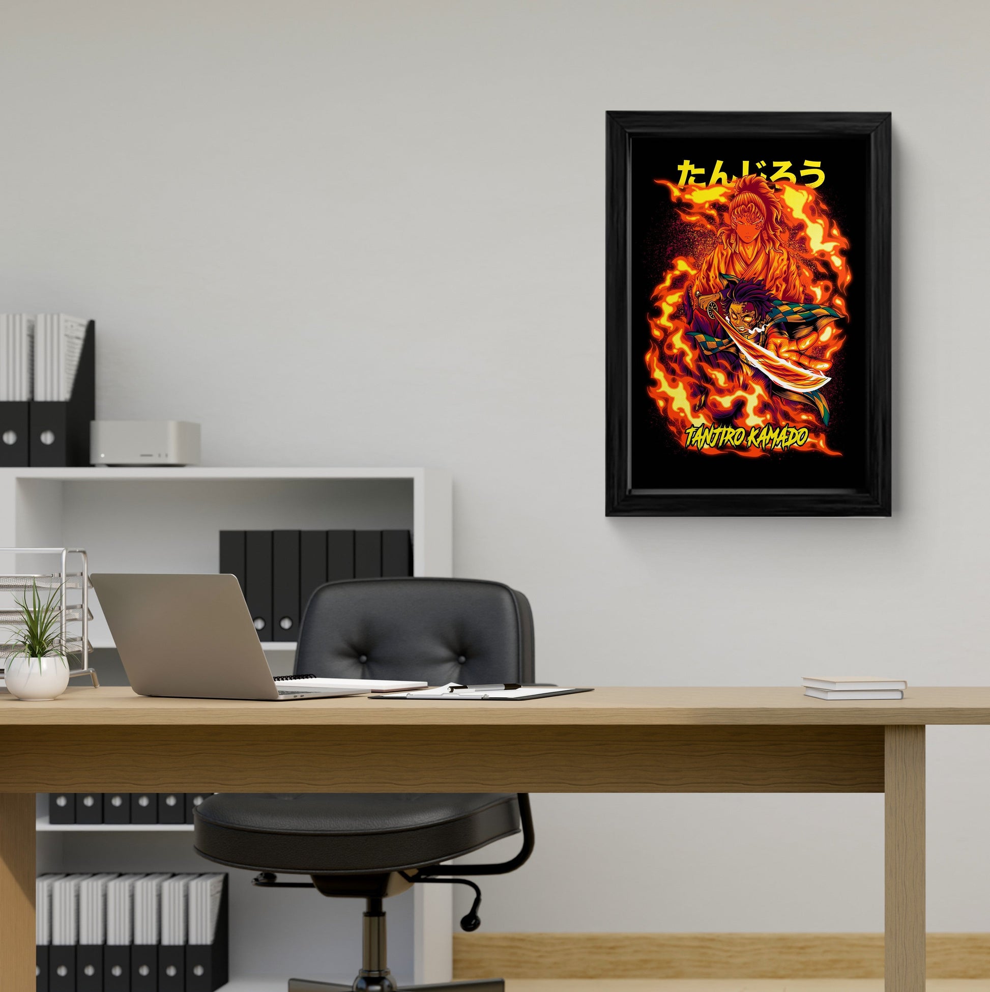 This vibrant and captivating framed art print features Tanjiro Kamado, the protagonist of the popular anime series, Demon Slayer: Kimetsu no Yaiba. The artwork showcases Tanjiro in a powerful pose, surrounded by flames, symbolizing his determination and strength. Perfect for any fan of the series, this high-quality canvas wall art will add a touch of Japanese culture and anime inspiration to your home.