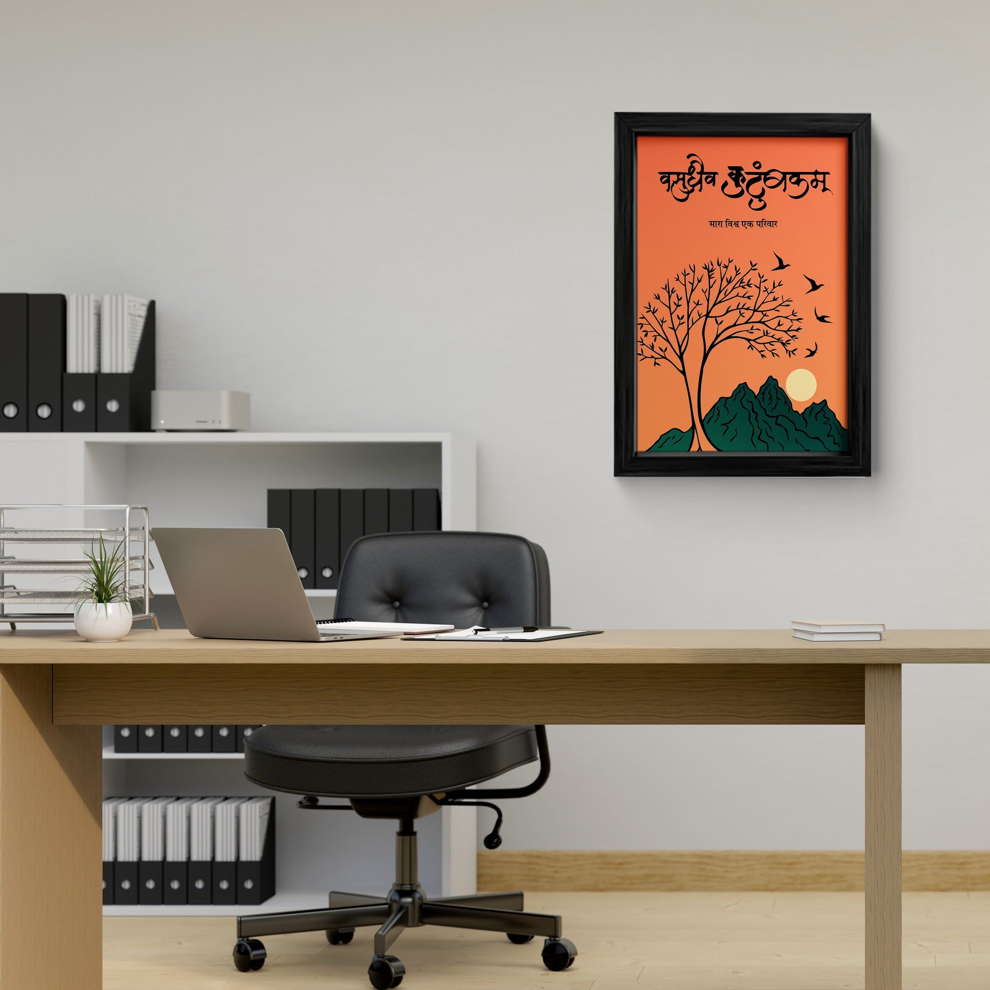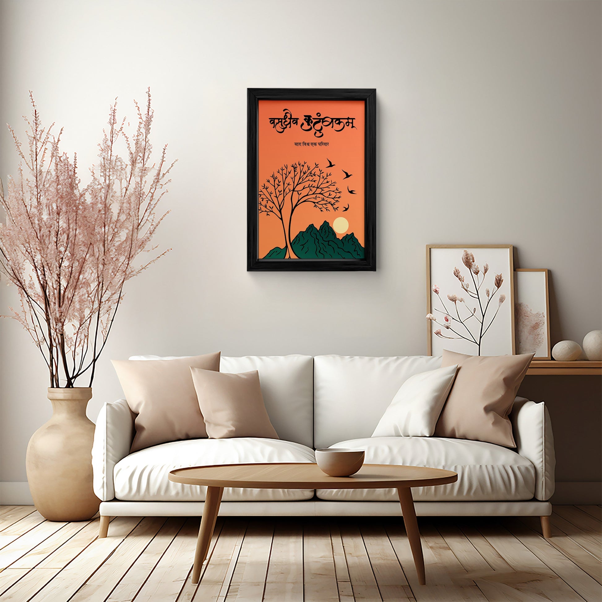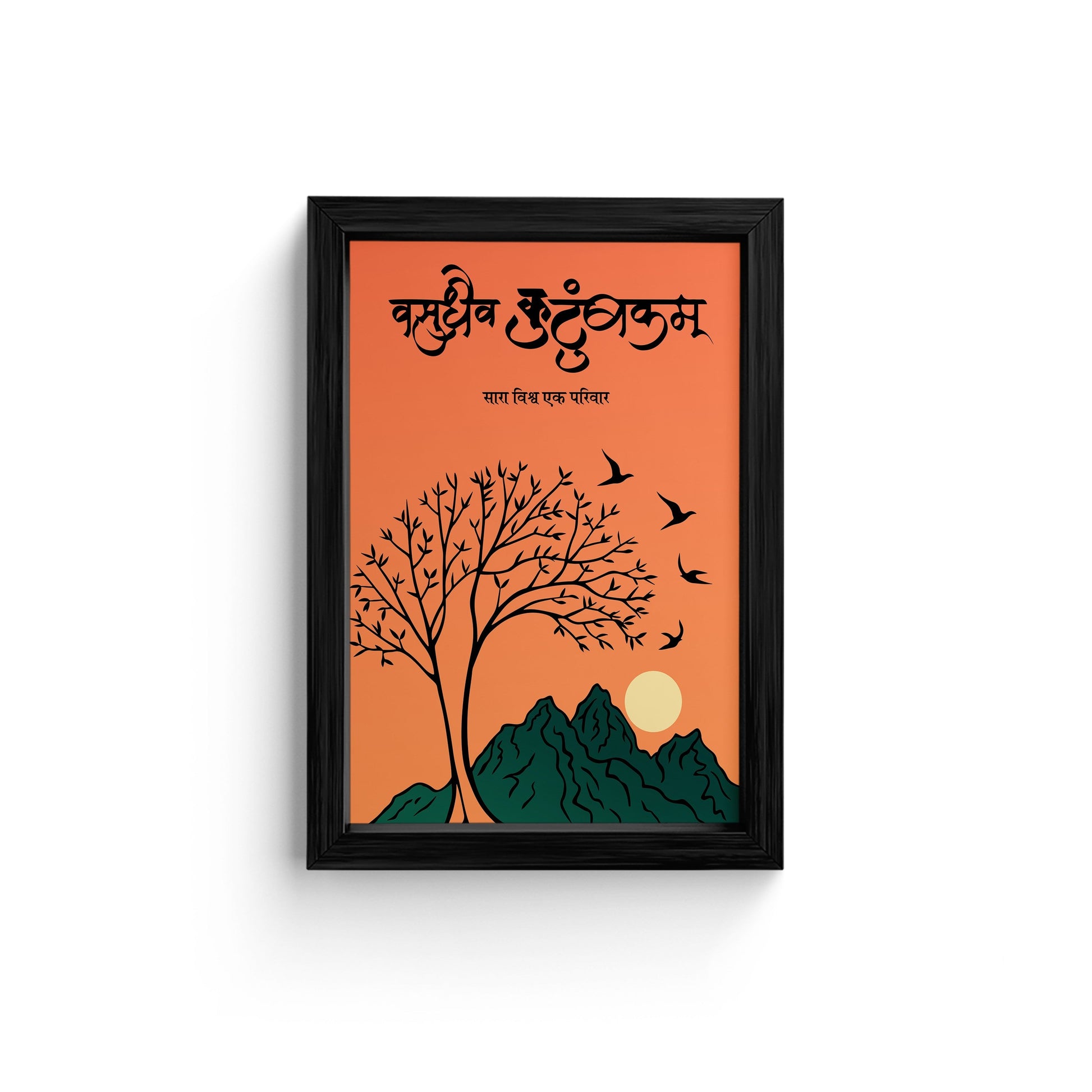 Inspire your space with this beautiful framed wall art featuring the powerful Sanskrit phrase "Vasudhaiva Kutumbakam," meaning "The world is one family." The artwork showcases a serene landscape with a tree, mountains, and birds, symbolizing unity and harmony. This piece is perfect for adding a touch of inspiration and positivity to your home or office. Crafted with high-quality materials, this wall art is both visually appealing and durable.