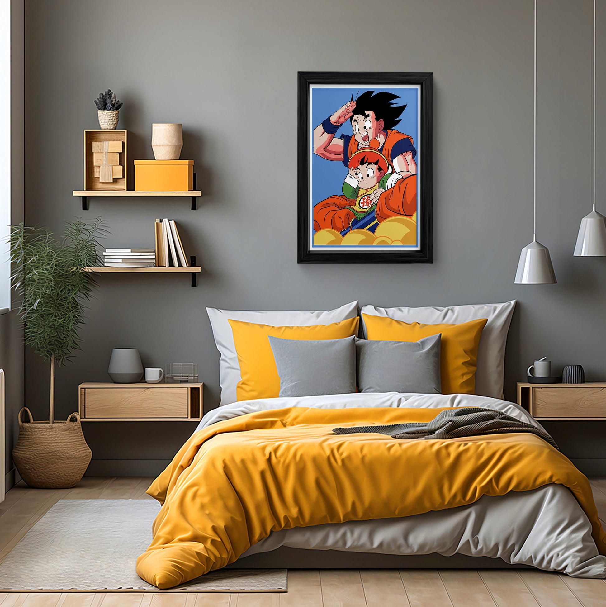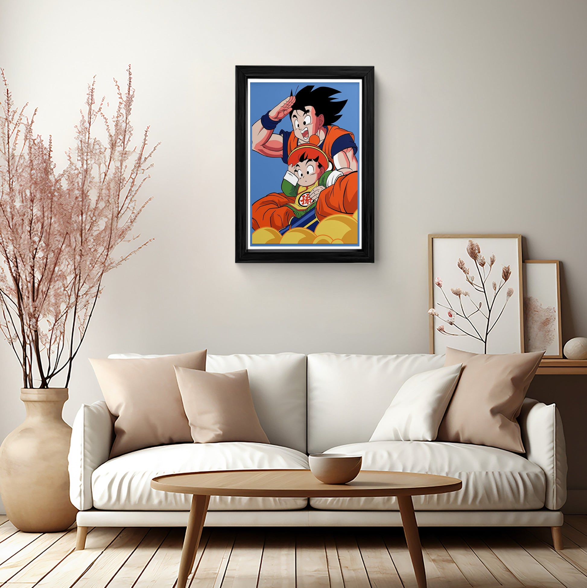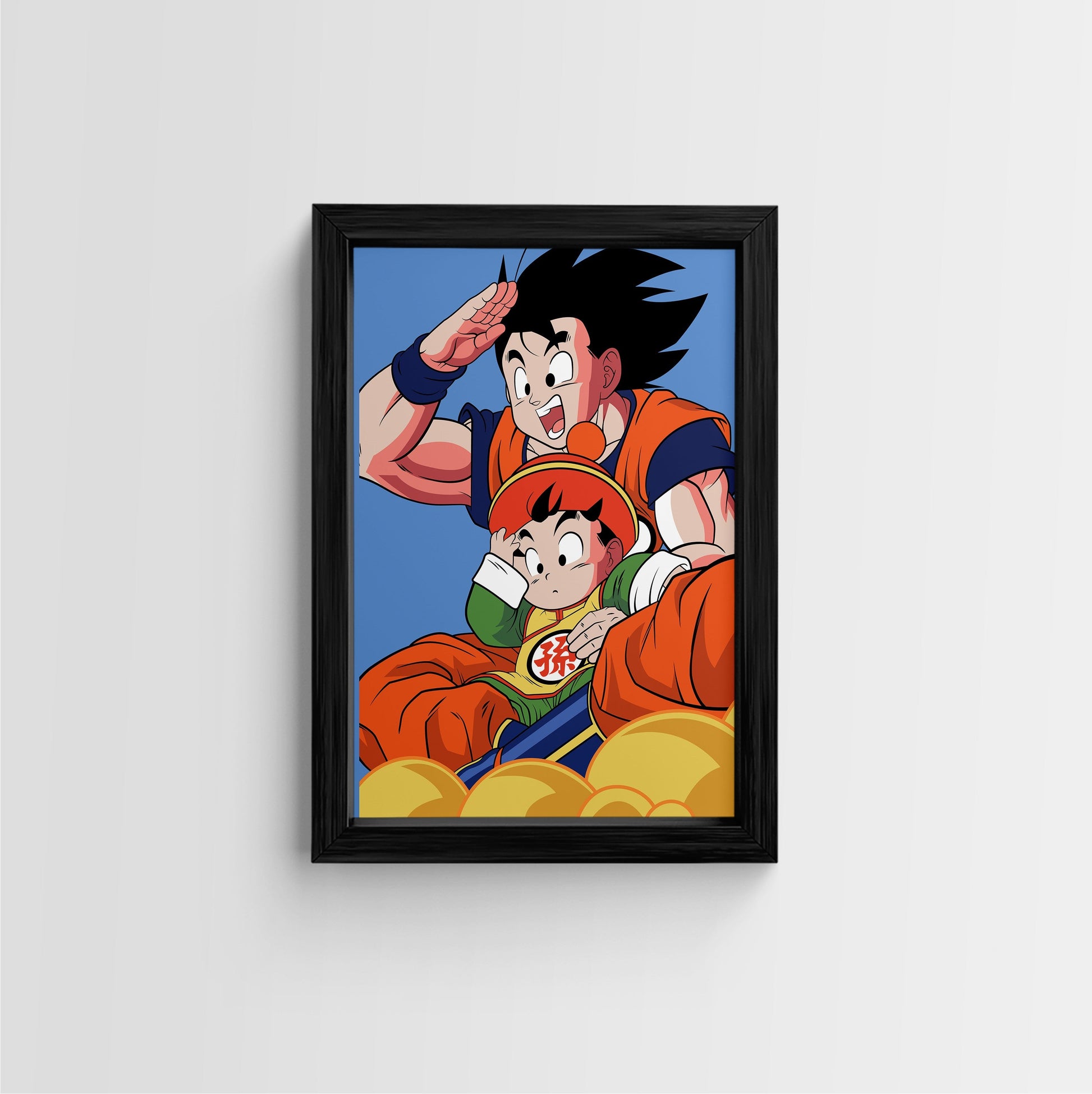 This nostalgic framed art print captures the heartwarming bond between Son Goku and his young son, Gohan, as they embark on a thrilling adventure. The vibrant colors and iconic Dragon Ball characters make this piece a perfect addition to any fan's home. Hang it on your wall and relive the excitement of their epic journeys.
