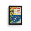 Dive into the serene beauty of Ecuador with this vintage travel poster. Capturing the essence of Ecuador’s enchanting fishing spots, clear skies, and abundant sunshine, this piece is a perfect addition for travel enthusiasts and art collectors alike.